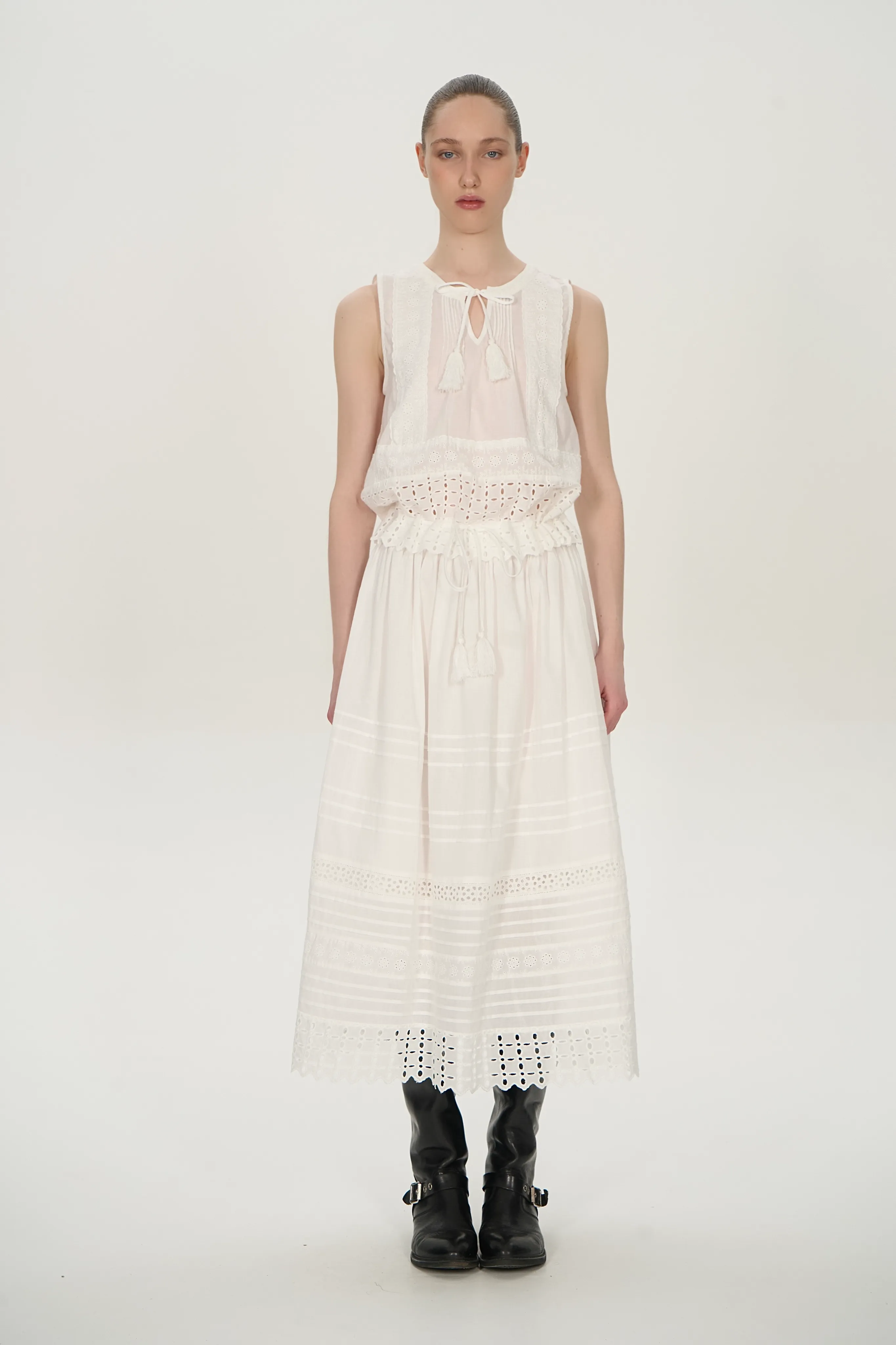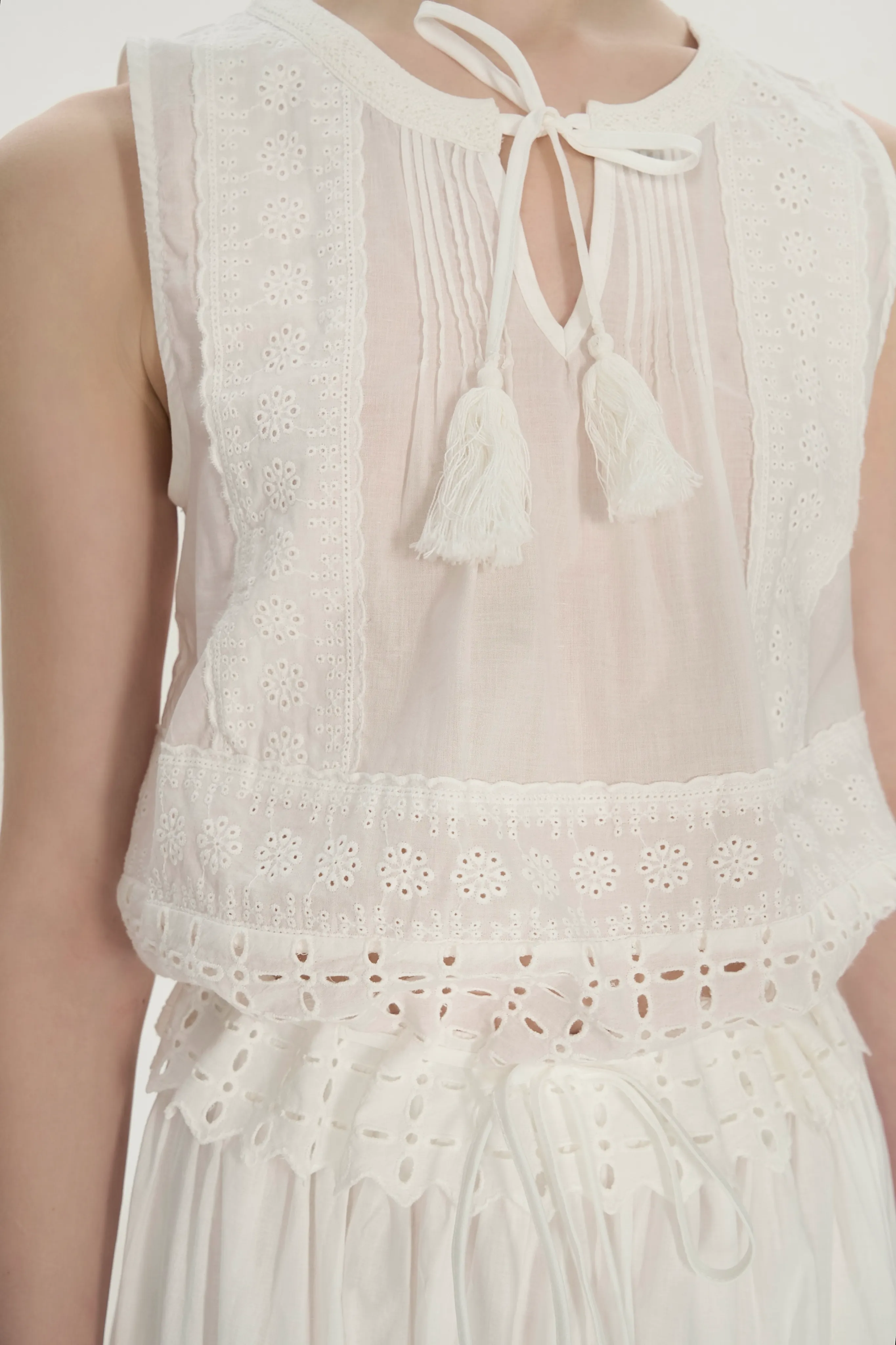 Блуза прямого силуэта, без рукавов, чуть удлиненная. Впереди застежка-щель с завязочками. Завязочки декорированы кистями хлопоквыми. По низу изделия хлопковый шнурок с кистями.