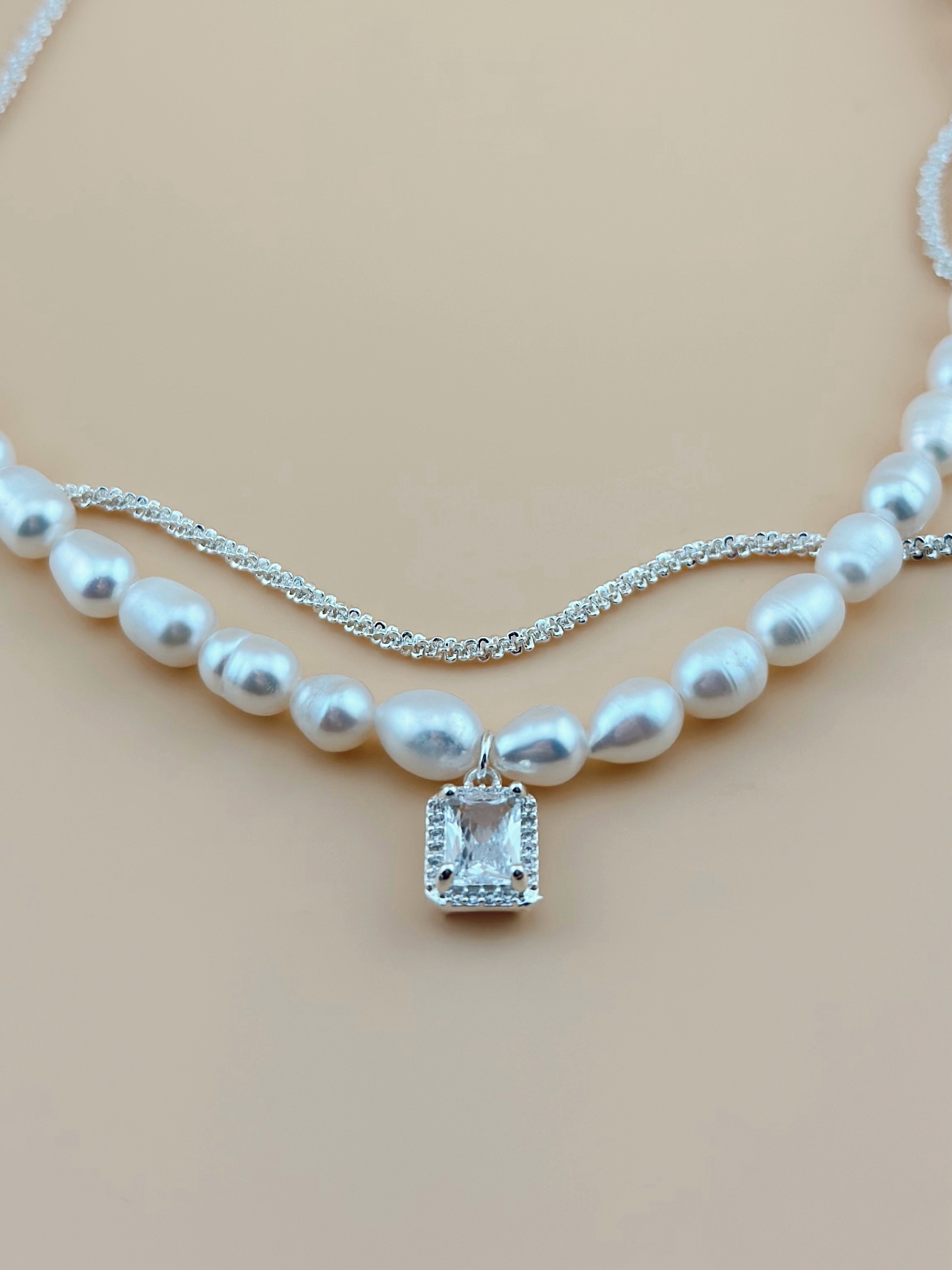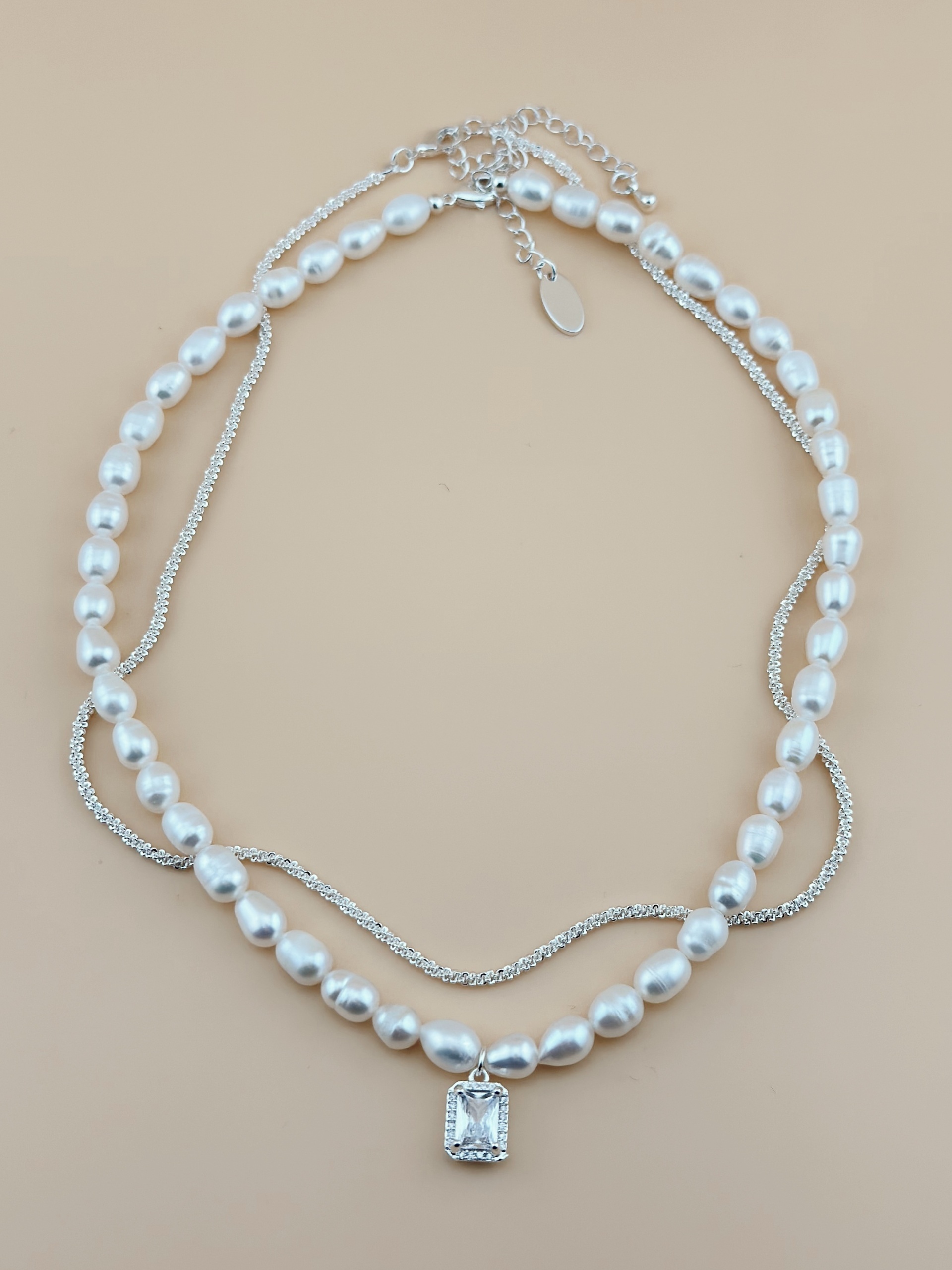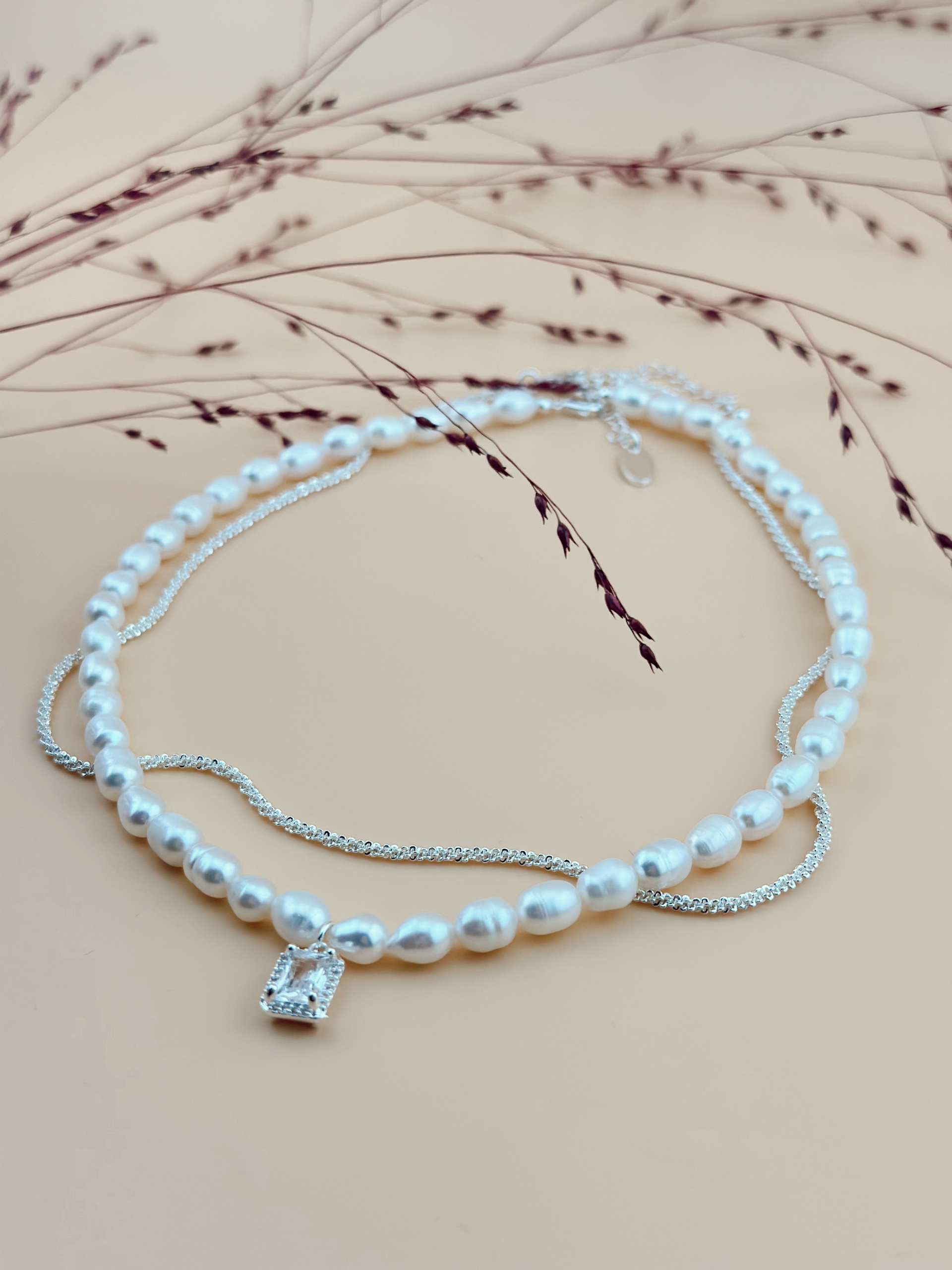 Колье жемчужное с доп. цепочкой и подвеской в виде белого кристалла