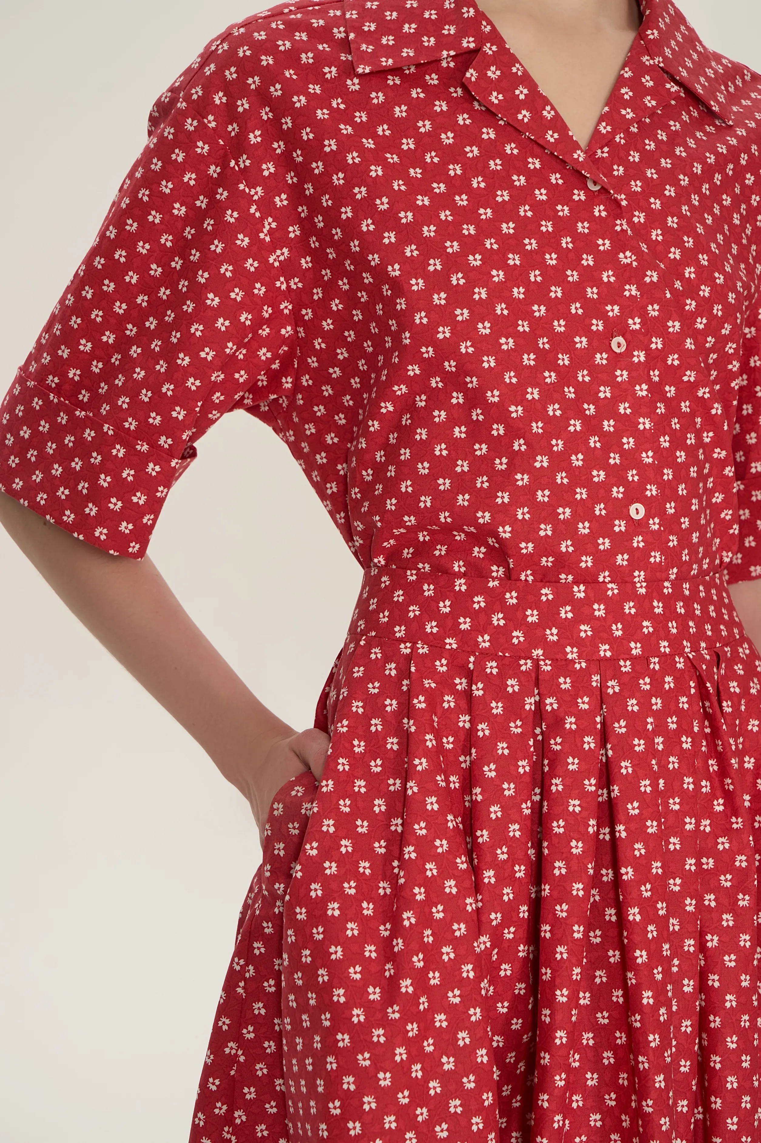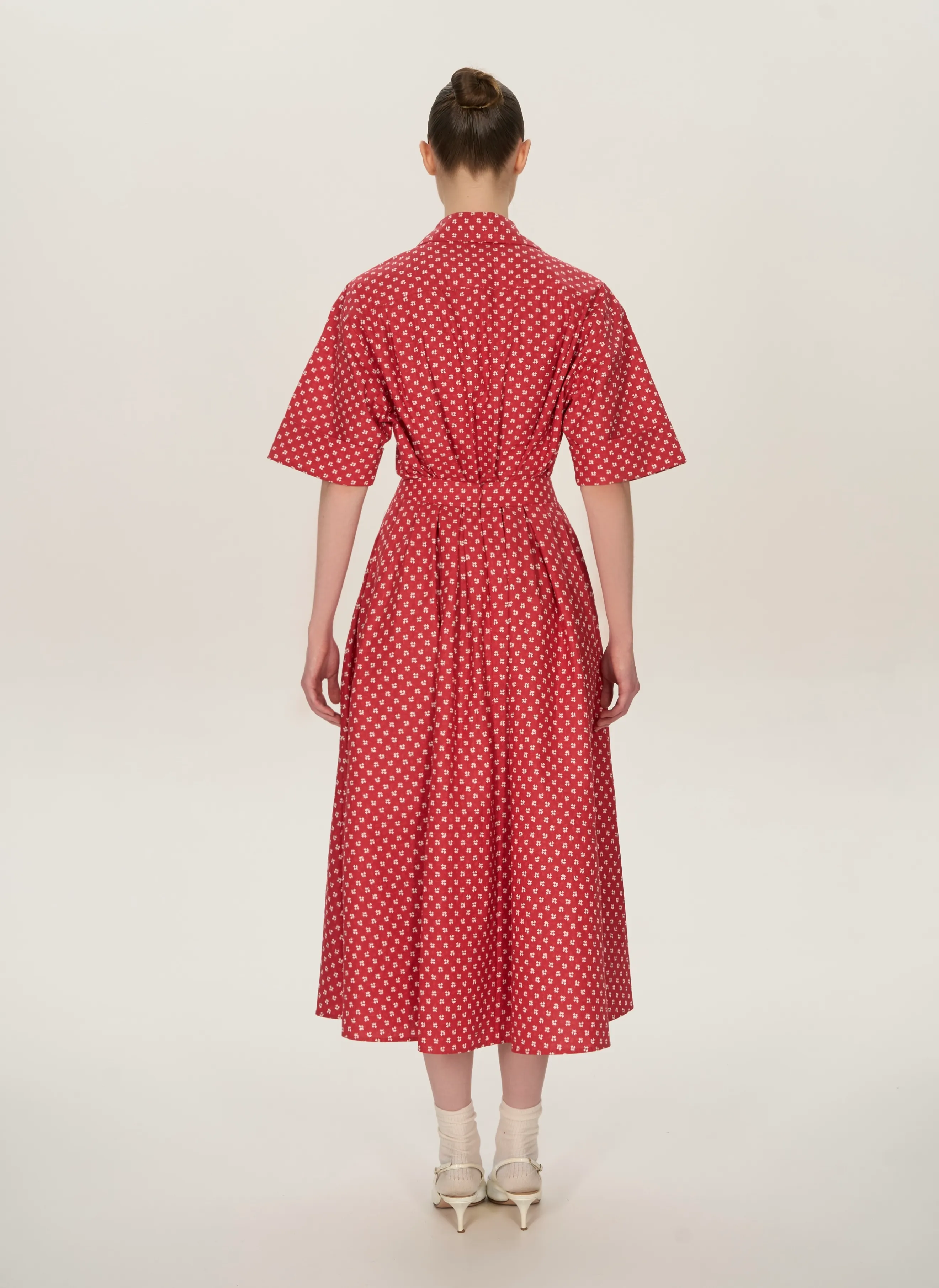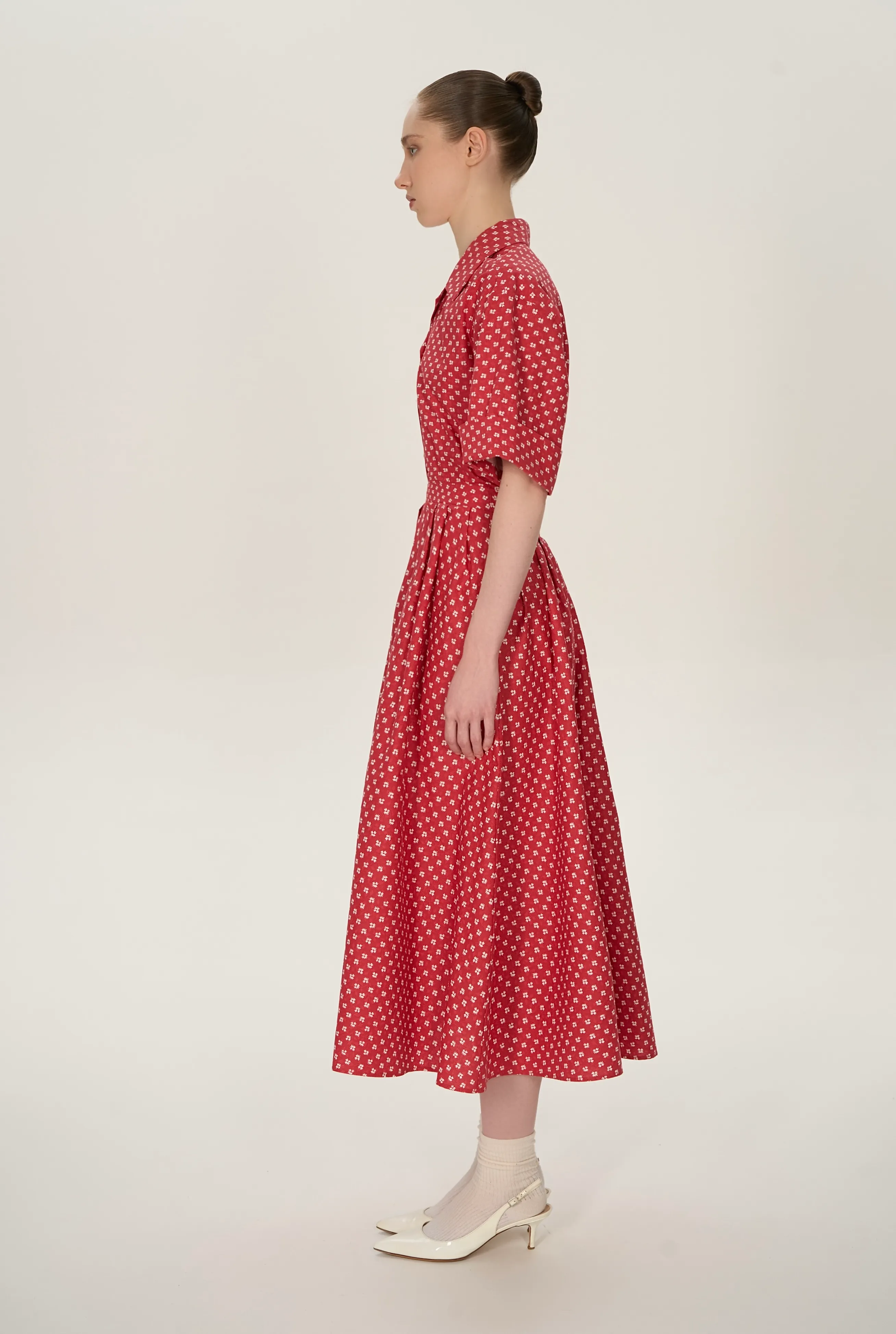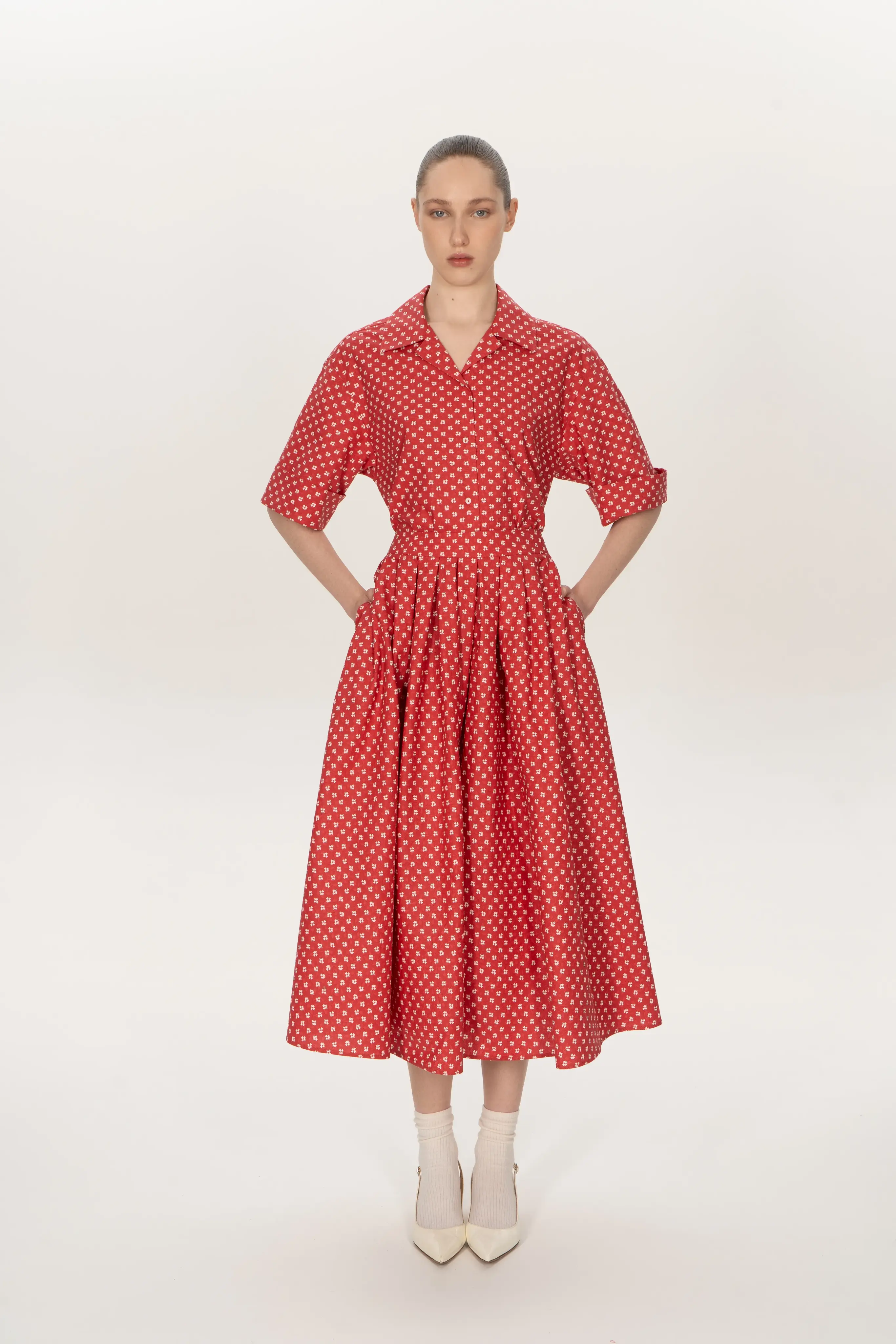 Костюм состоит из пышной юбки миди с бантовыми складками на поясе и молнией сзади, и рубашкой с коротними рукавами. Рубашка с пуговицами по переду, с отложным воротником.