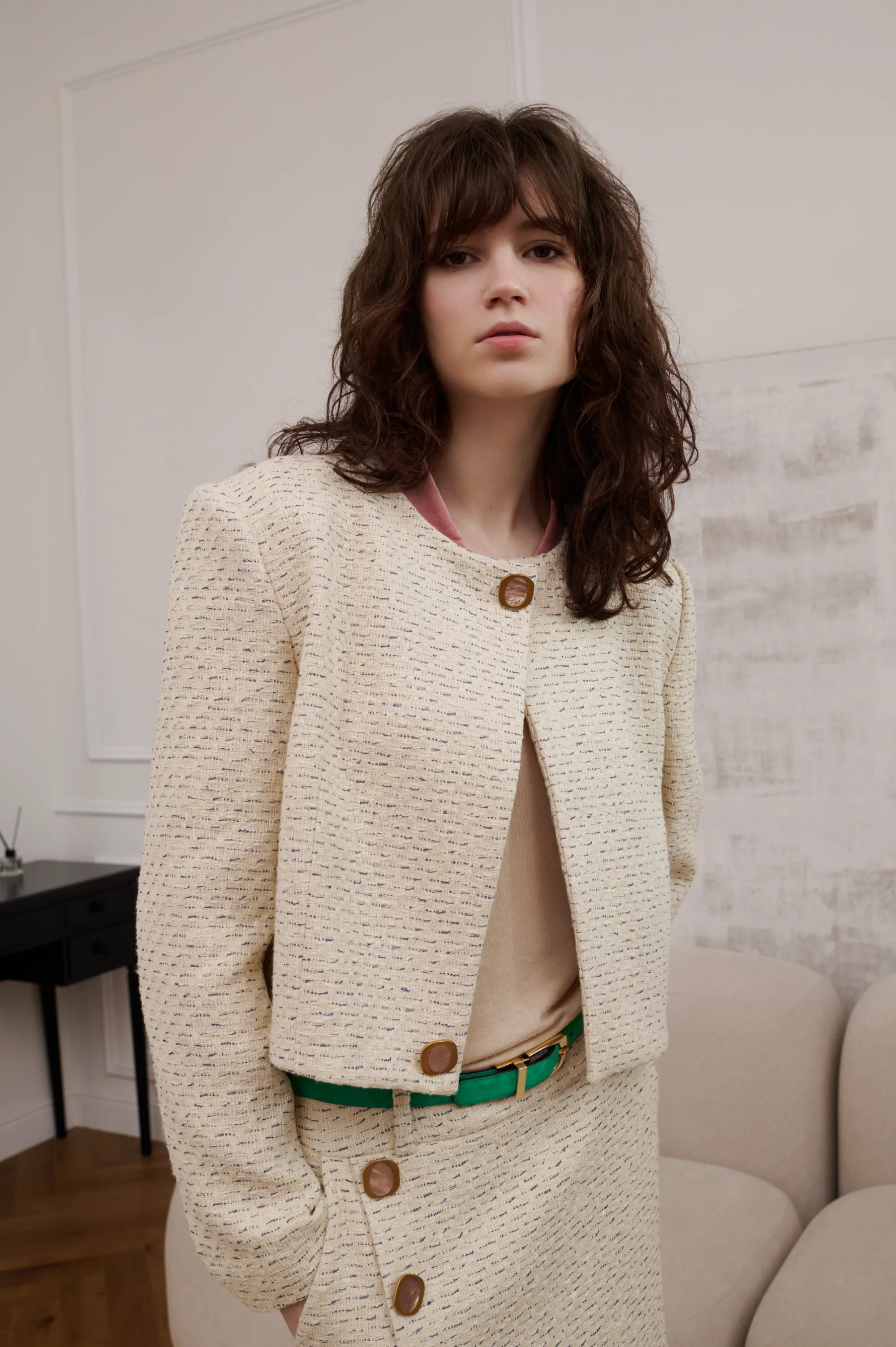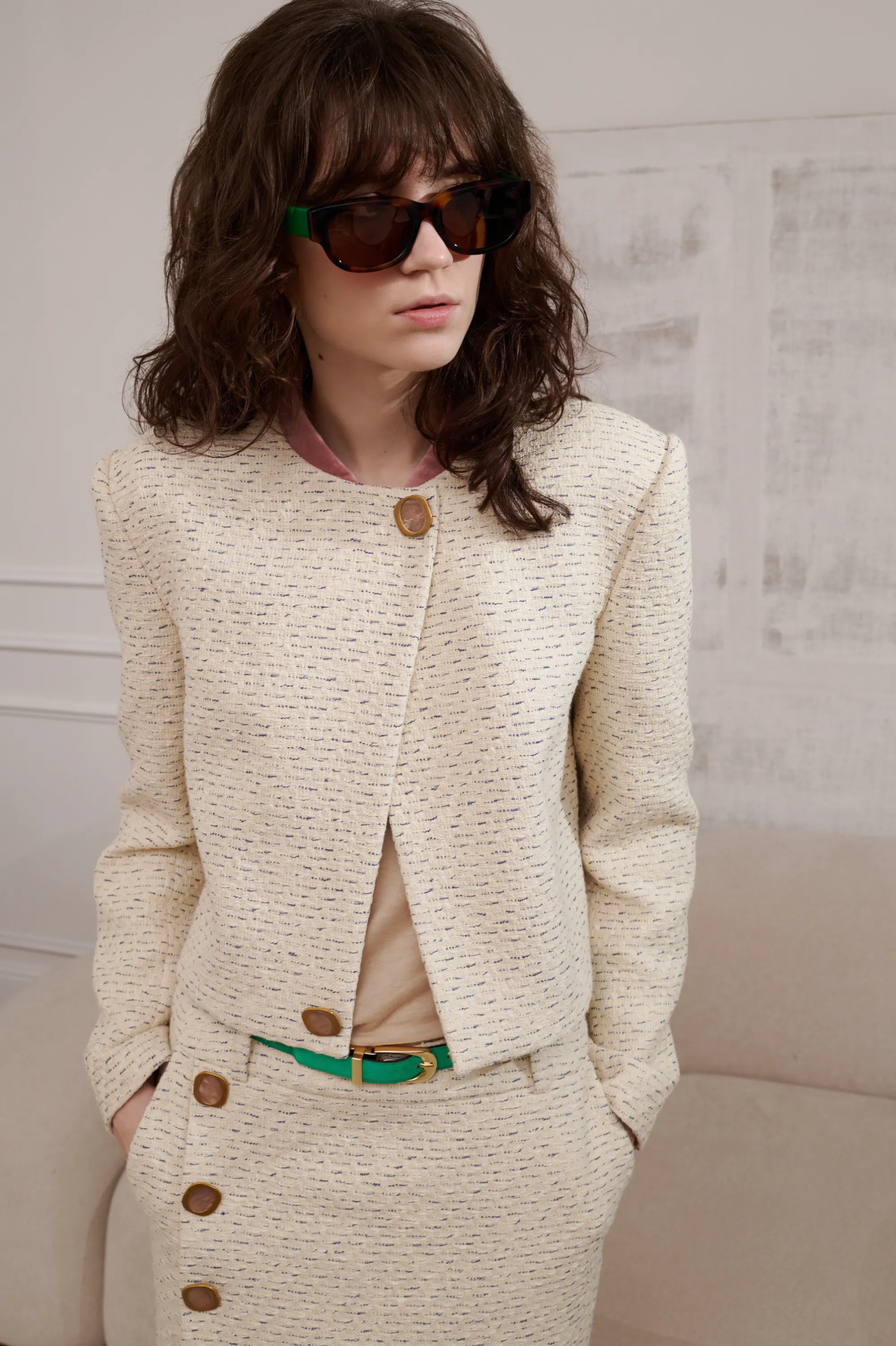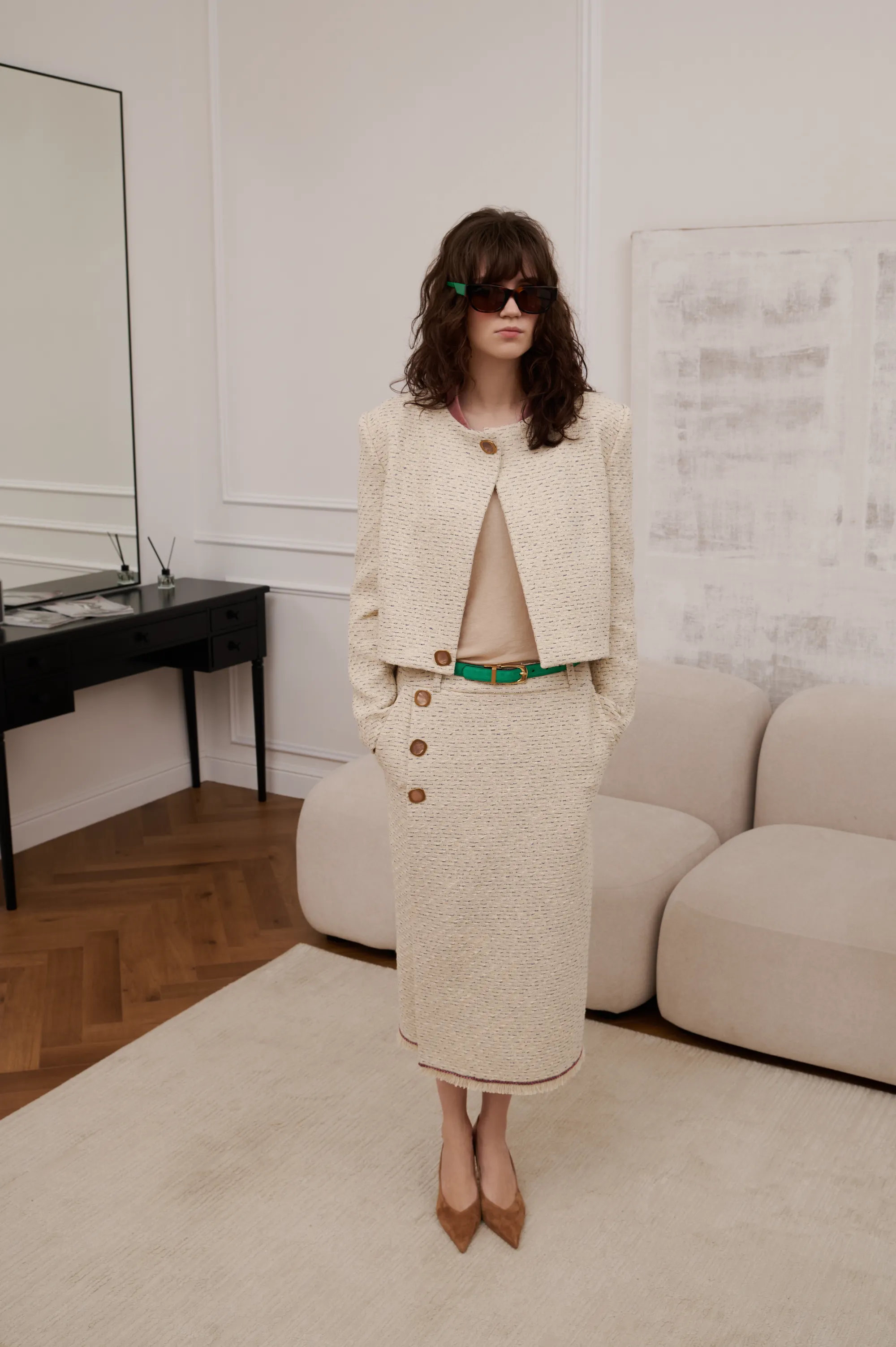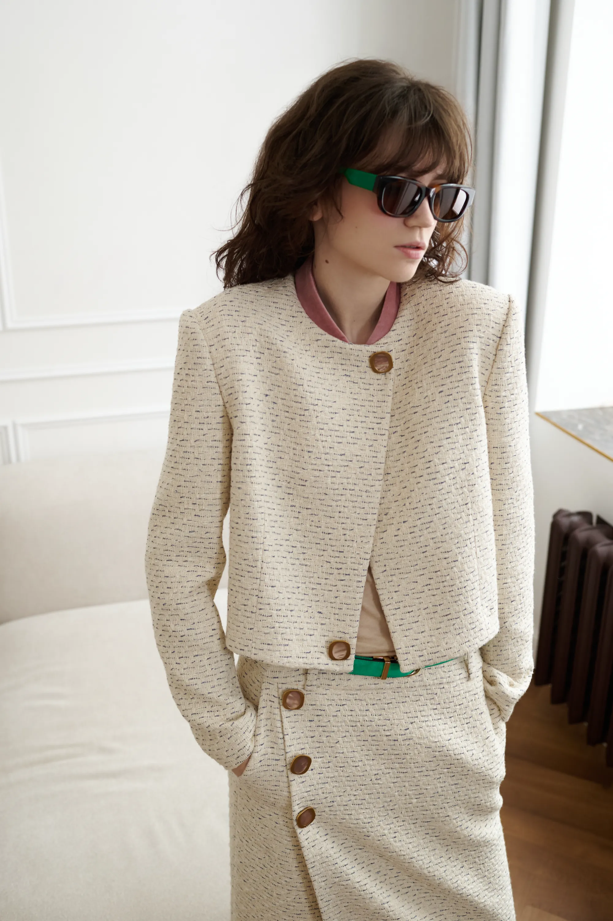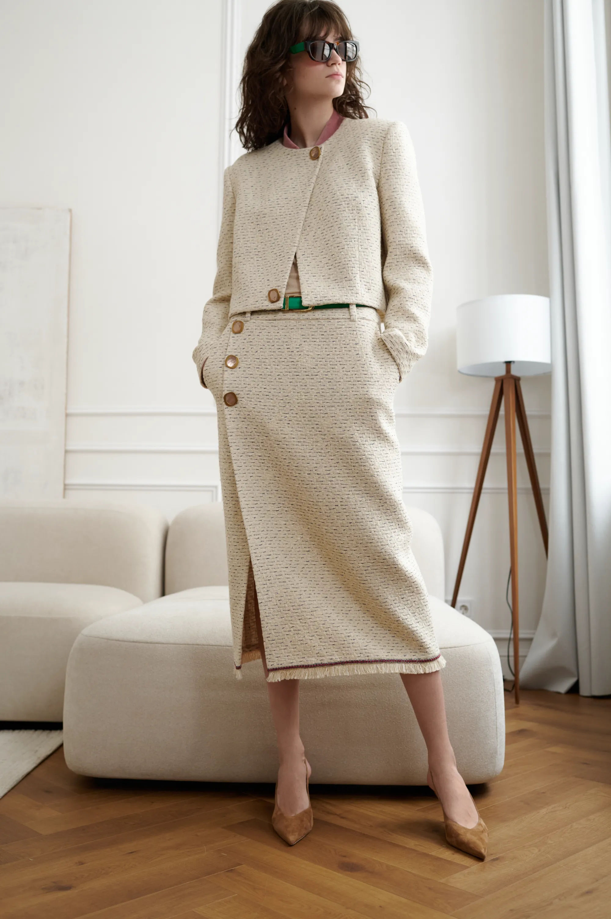 Костюм летний, твидовый. На подкладке. Костюм состоит из двух частей: пиджака и юбки. Пиджак усилен плечами. Декорирован бархатной тканью по воротнику и двумя пуговицами с натуральным перламутром. Основная ткань - 100% хлопок. Подкладка 100% вискоза. Юбка - миди, с запахом. Застежка - молния в боковом шве. С боковыми карманами. Юбка декорирована по краю бахромой и бархатной тесьмой, а также двумя большими пуговицами с натуральным перламутром.