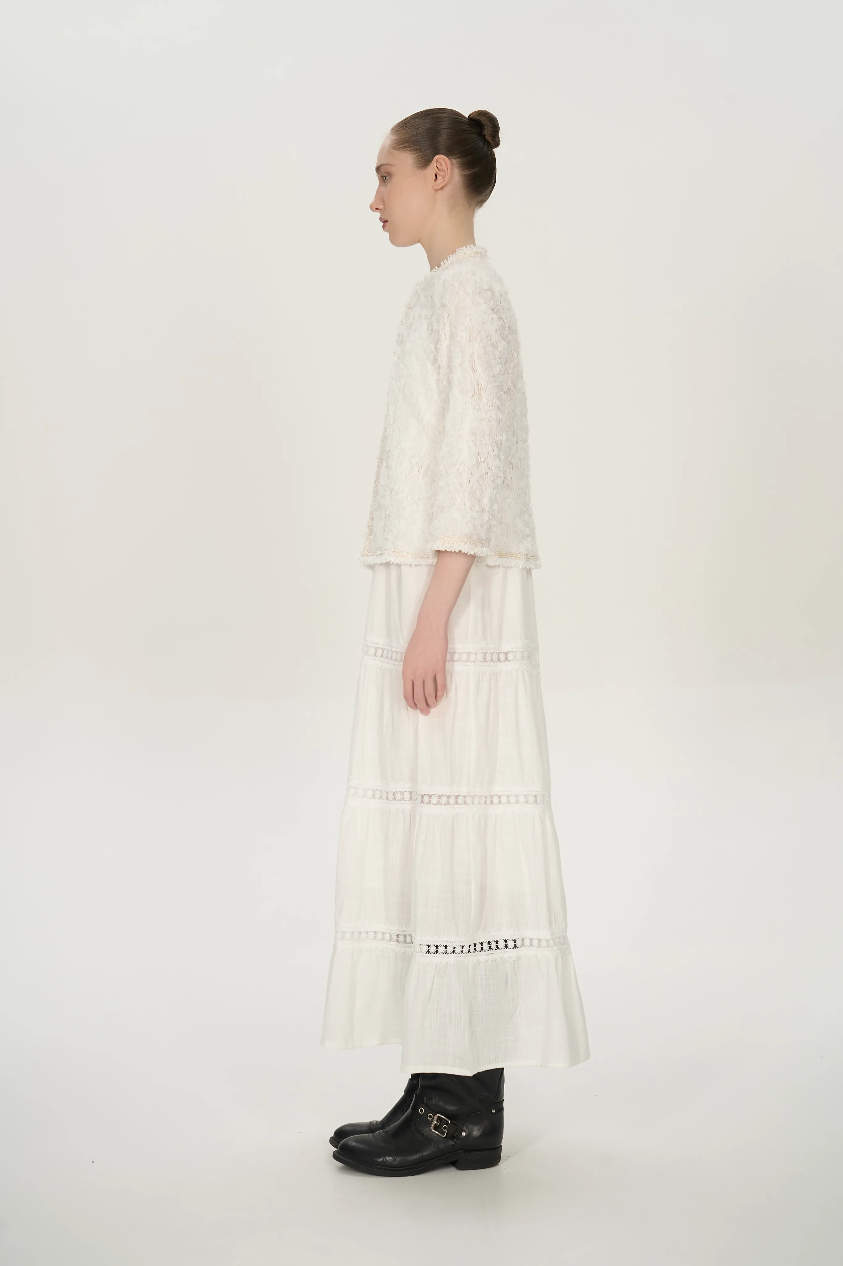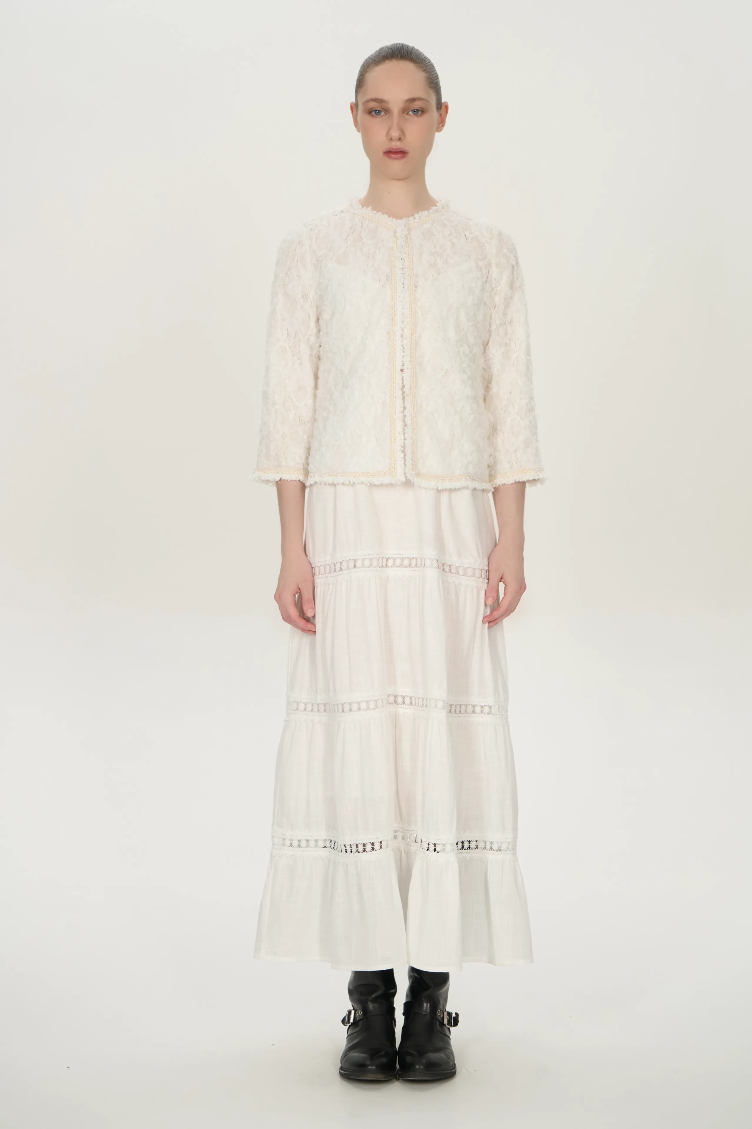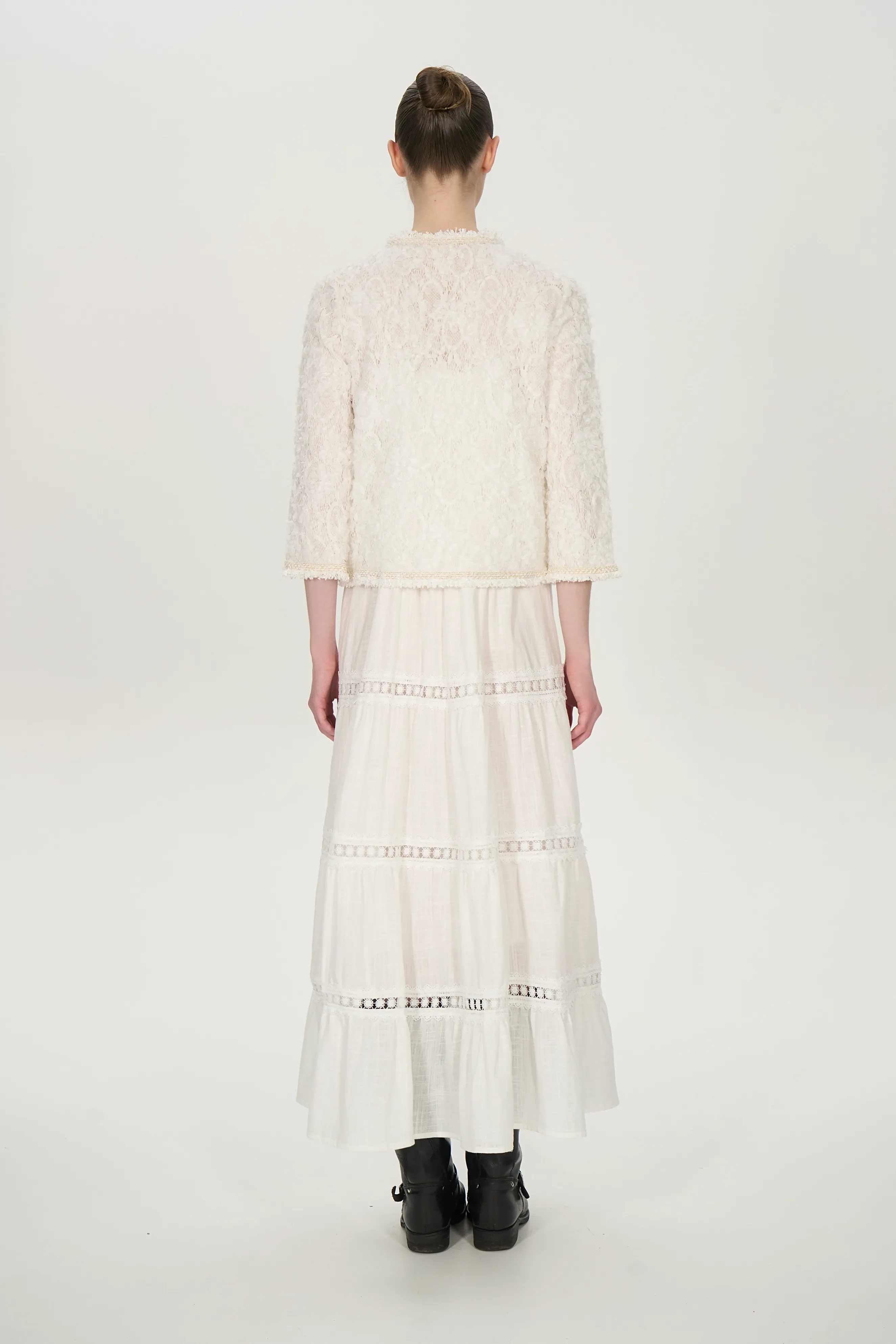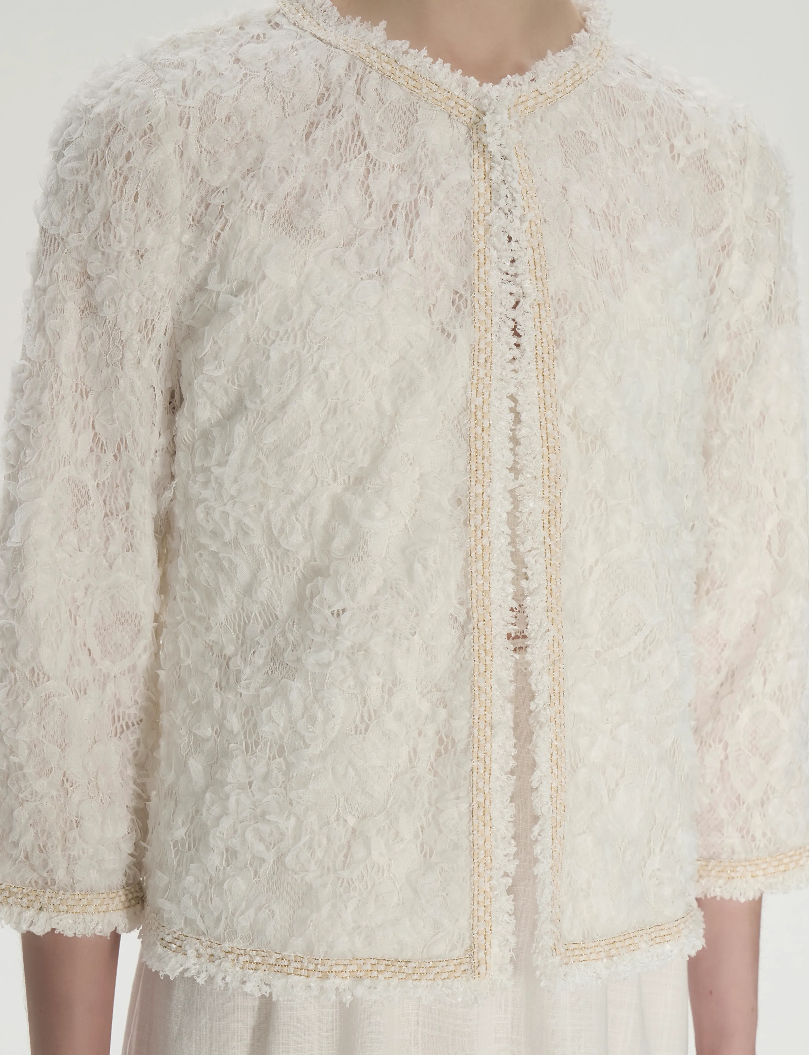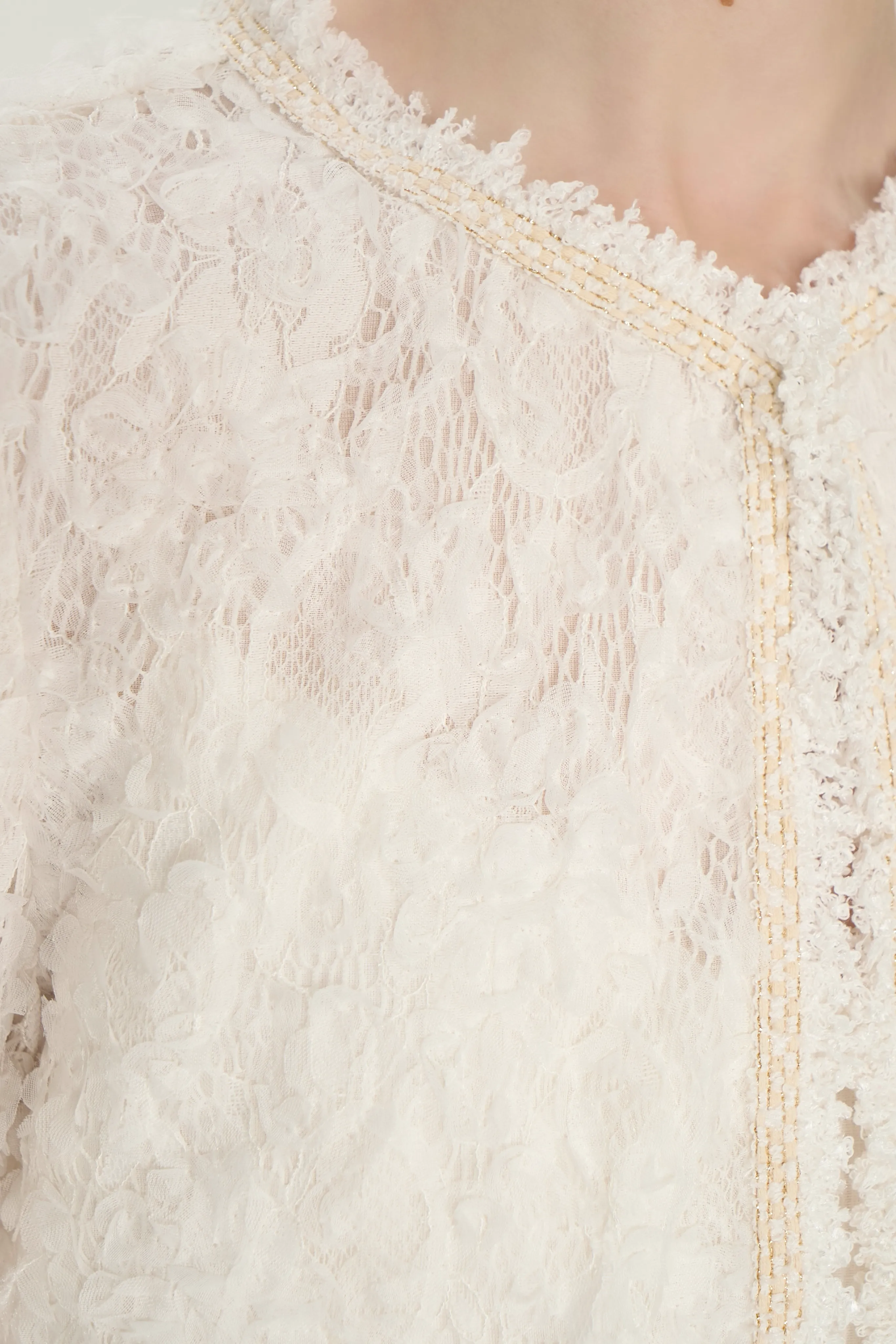 Нарядный пиджак из кружевной ткани на тонкой подкладке. Рукав чуть укороченный. Горловина, борта пиджака, край пиджака и рукава - декорированы нарядной тесьмой. Основная ткань: 100% пэ, подкладка 100% хлопок.