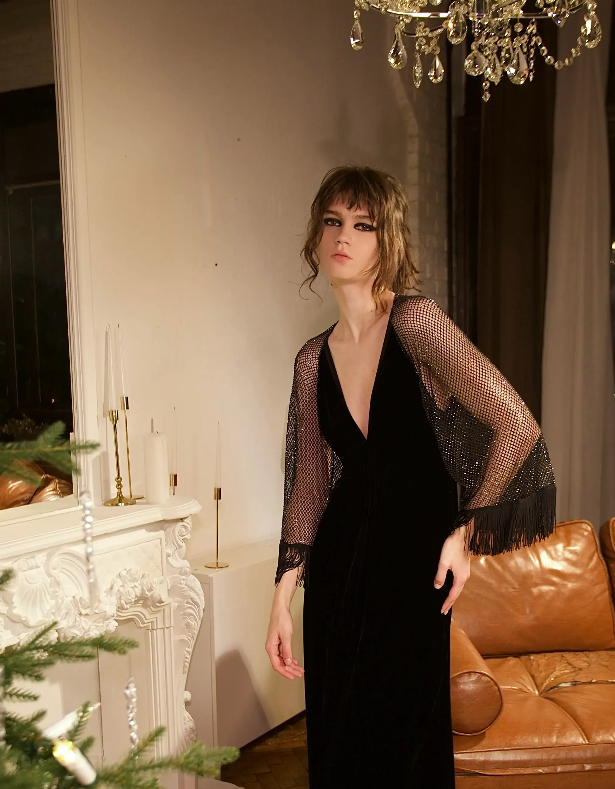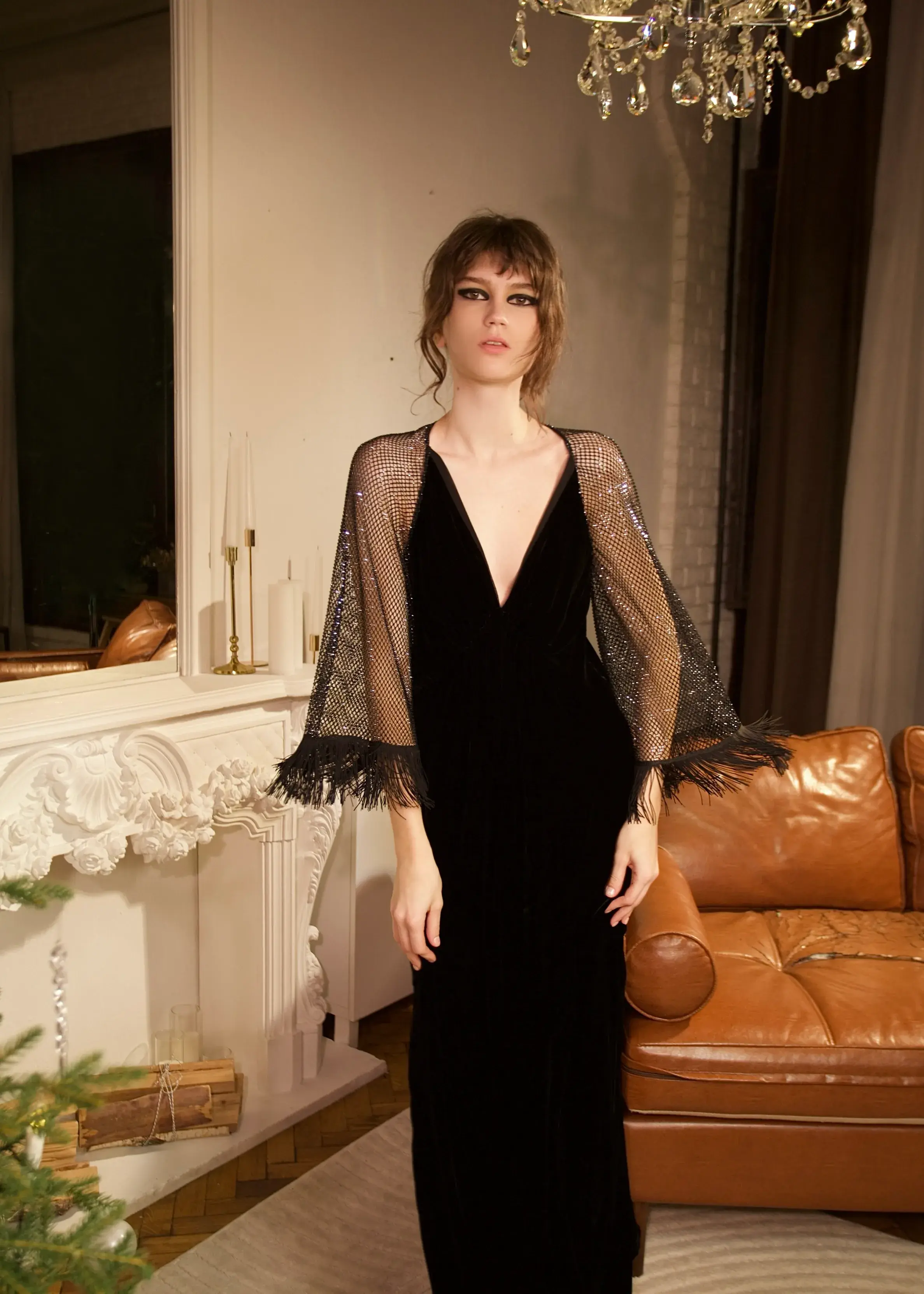Роскошное платье макси прямого силуэта, с глубоким вырезом в зоне декольте. Рукава и часть спинки декорированы сеткой с кристаллами. Края рукавов декорированы бахромой