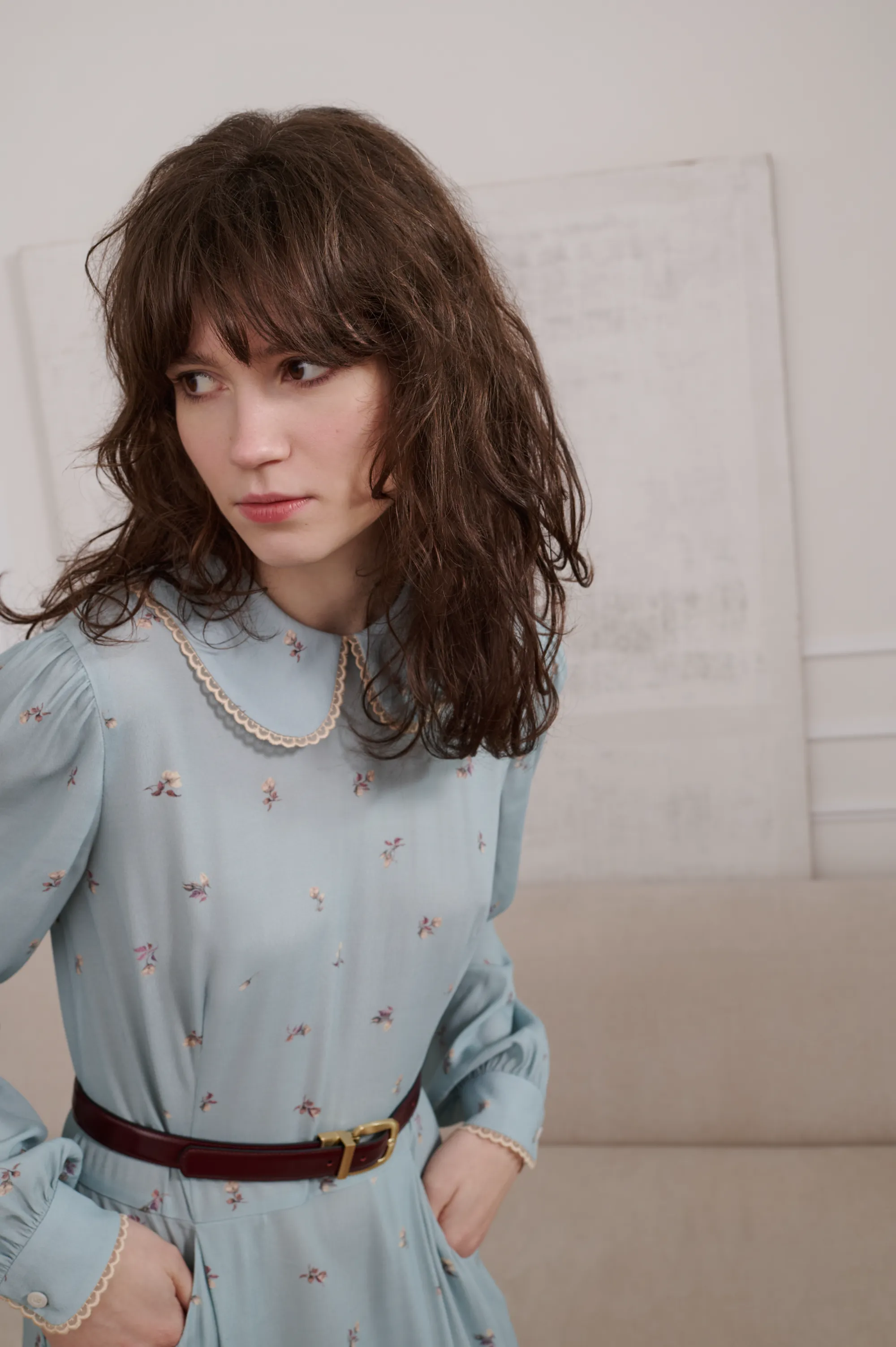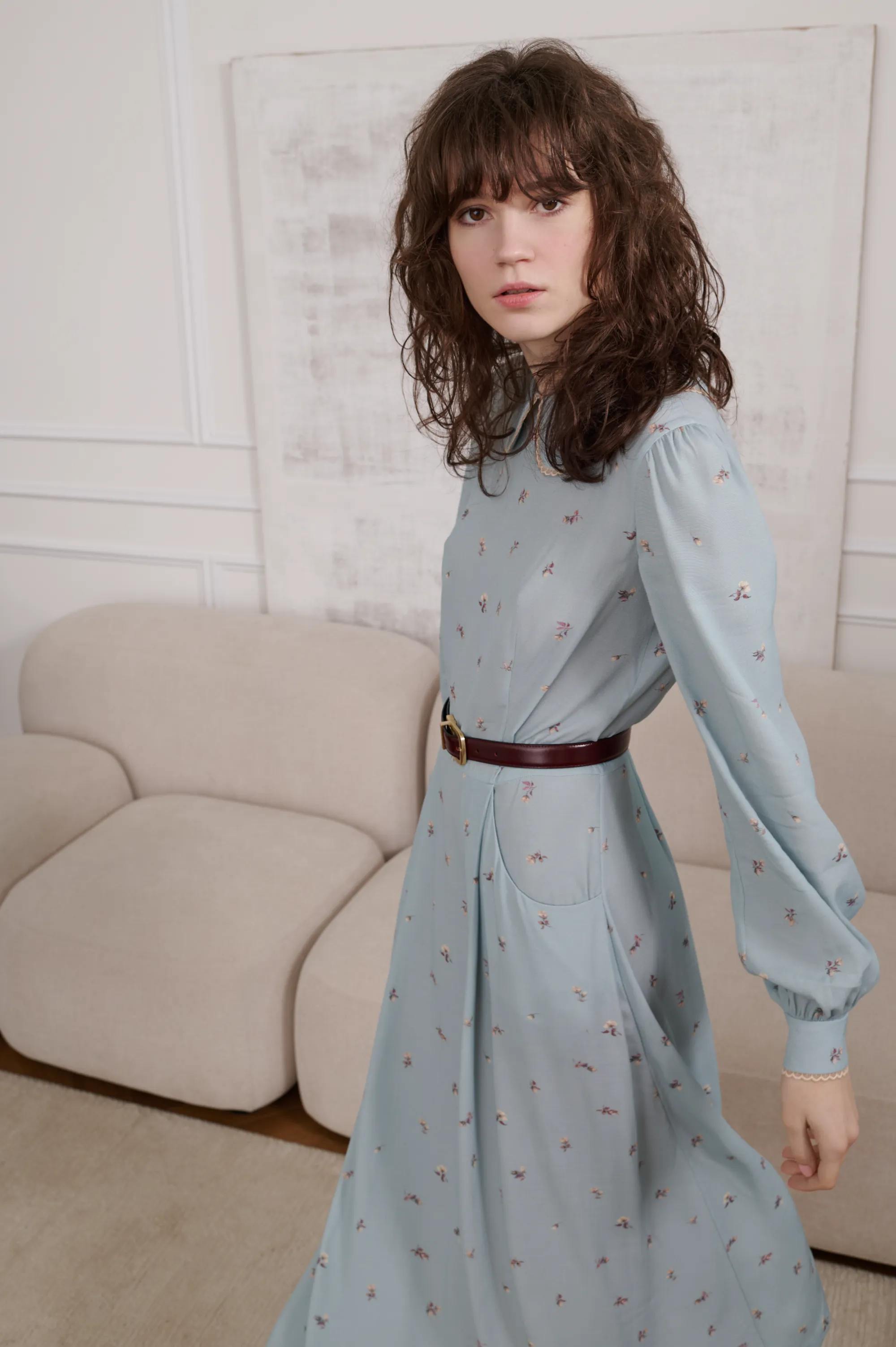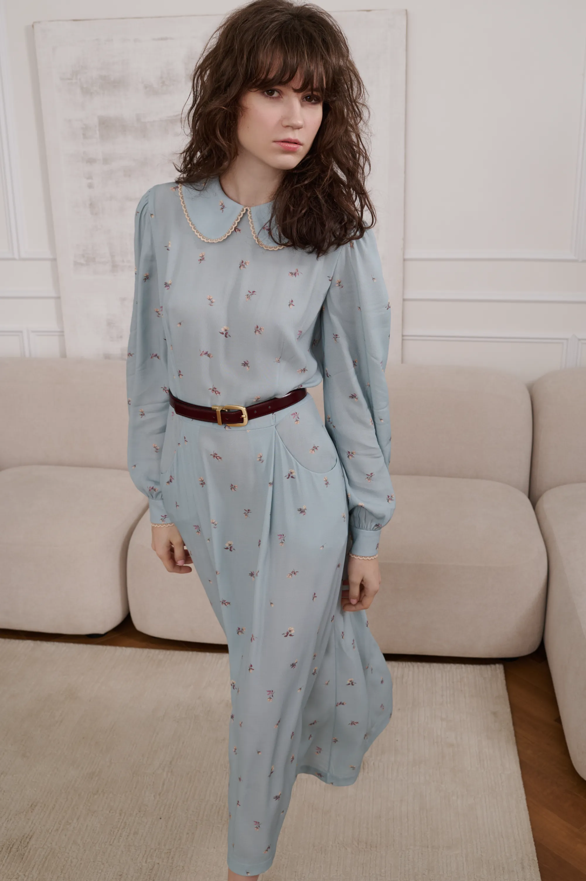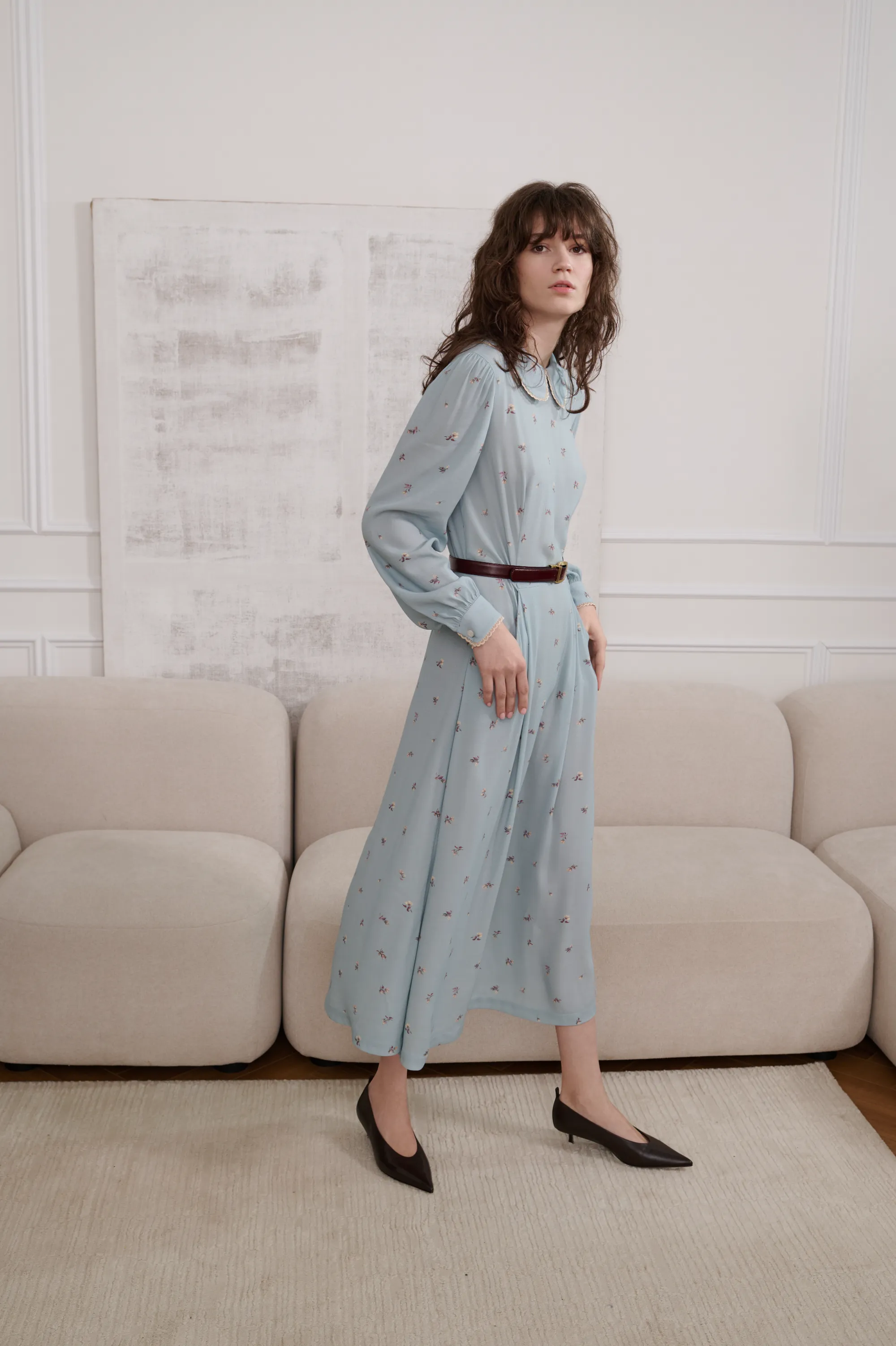 Платье миди, приталенного силуэта, отрезное по линии талии. С чуть расклешенной юбкой. Платье декорировано по воротнику и манжетам французским кружевом. Застежка – молния по спинке.