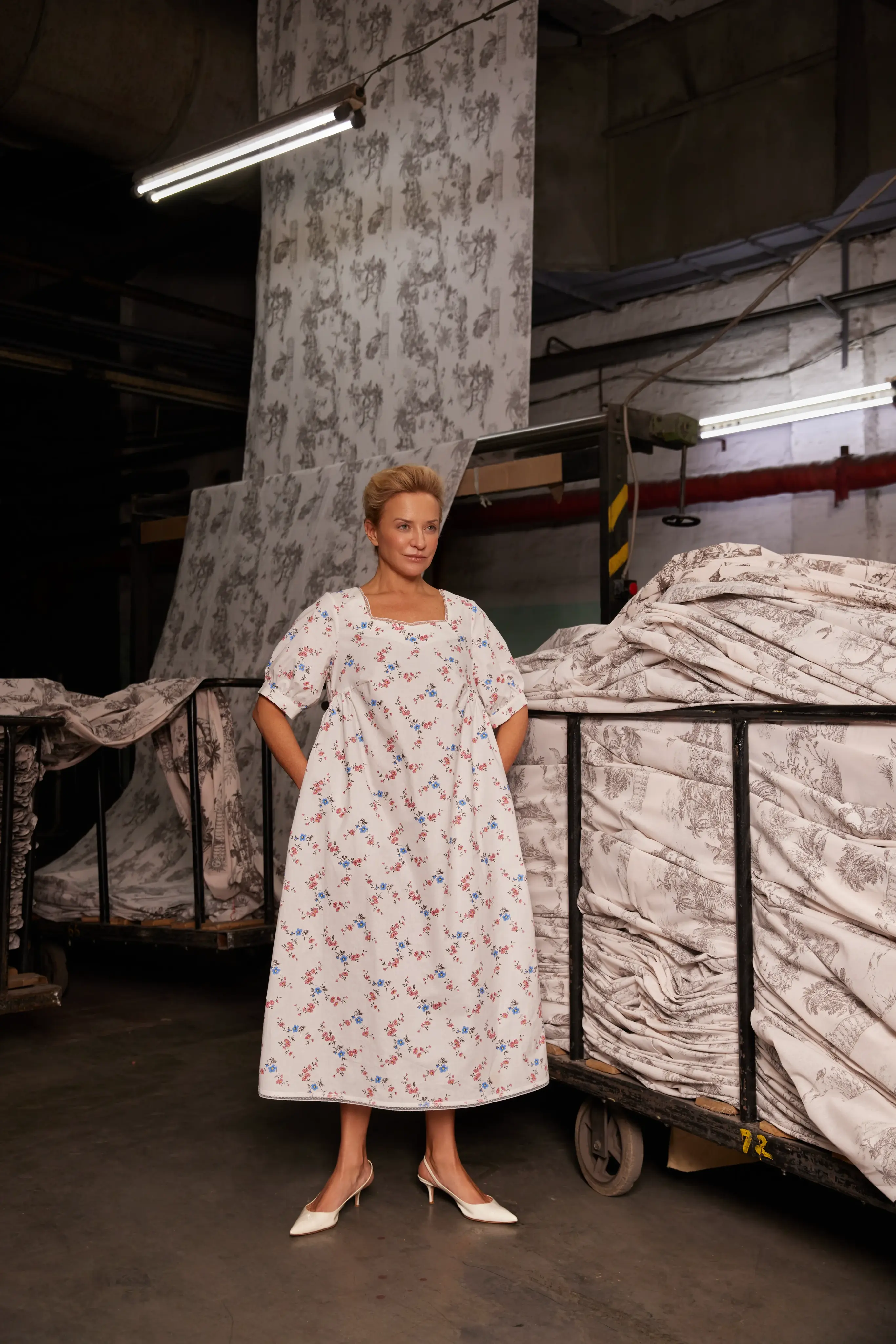 Платье миди обьемного силуэта с отрезной юбкой по чуть завышенной линии талии Рукава "фонарик", втачные обьемные на манжете с пуговицей. Платье декорировано по горловине, полочке французским кружевом