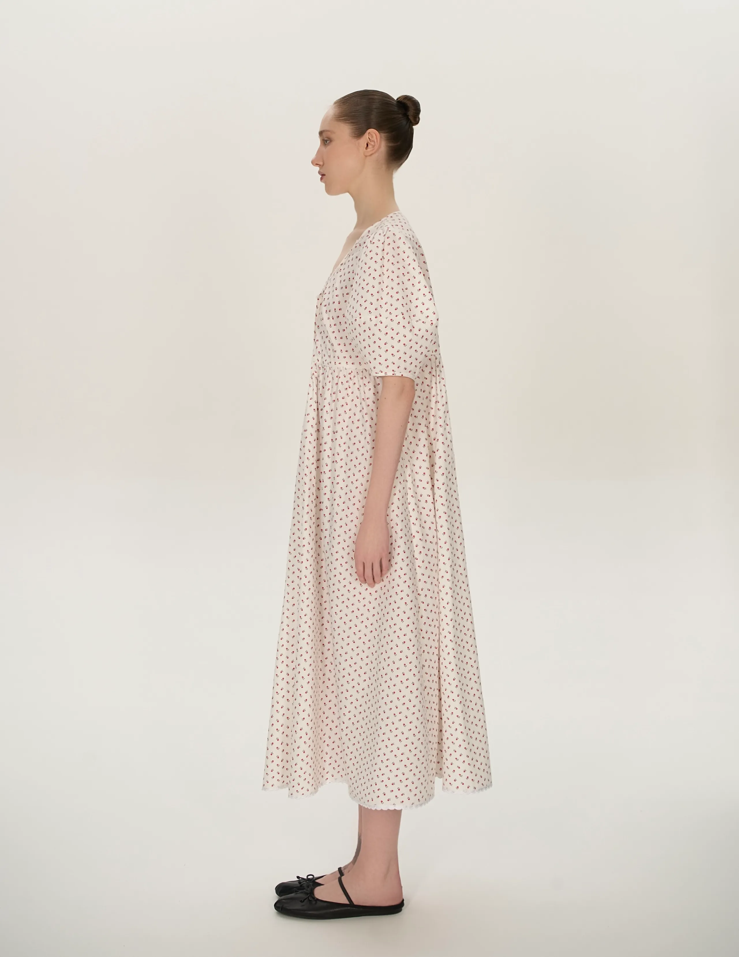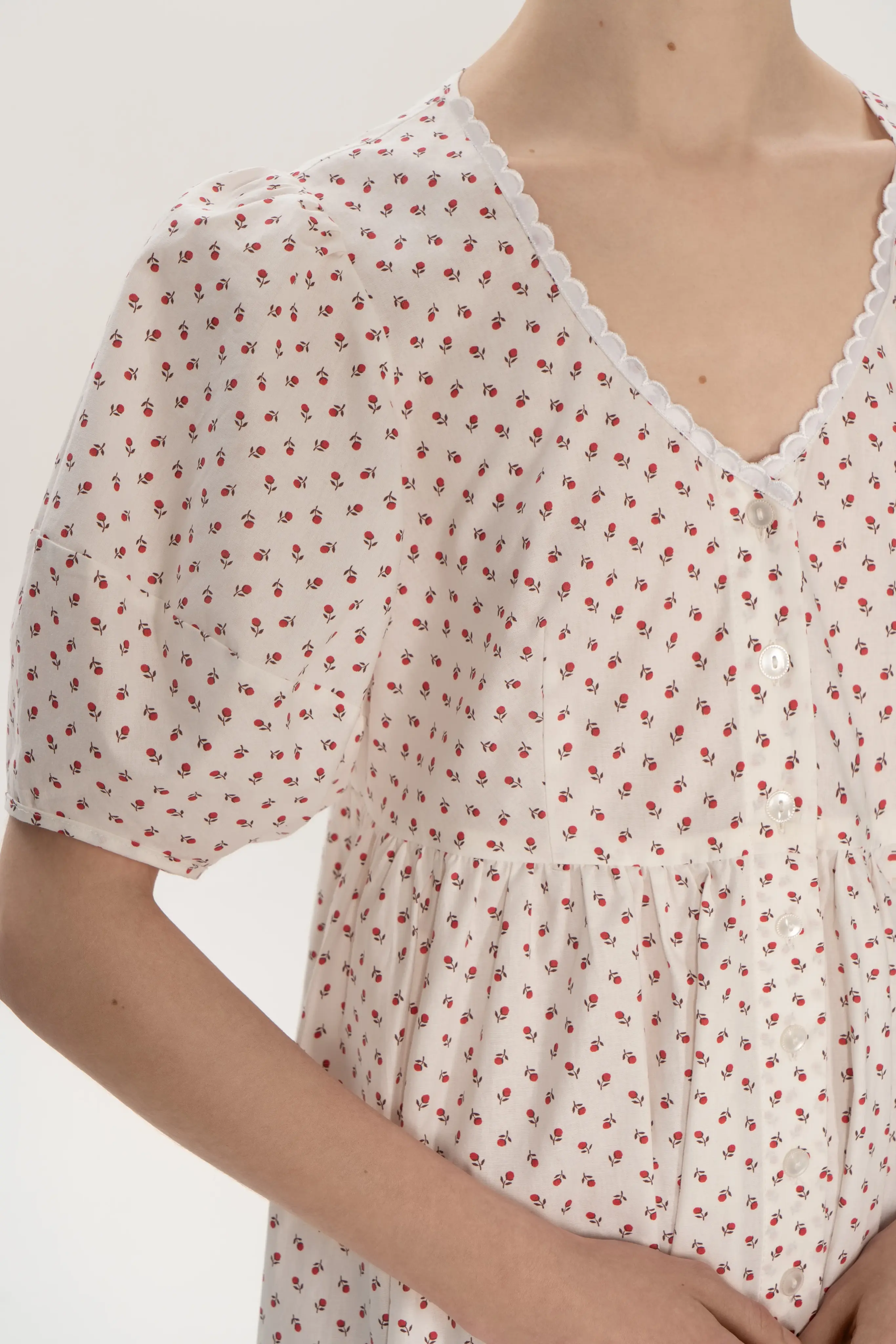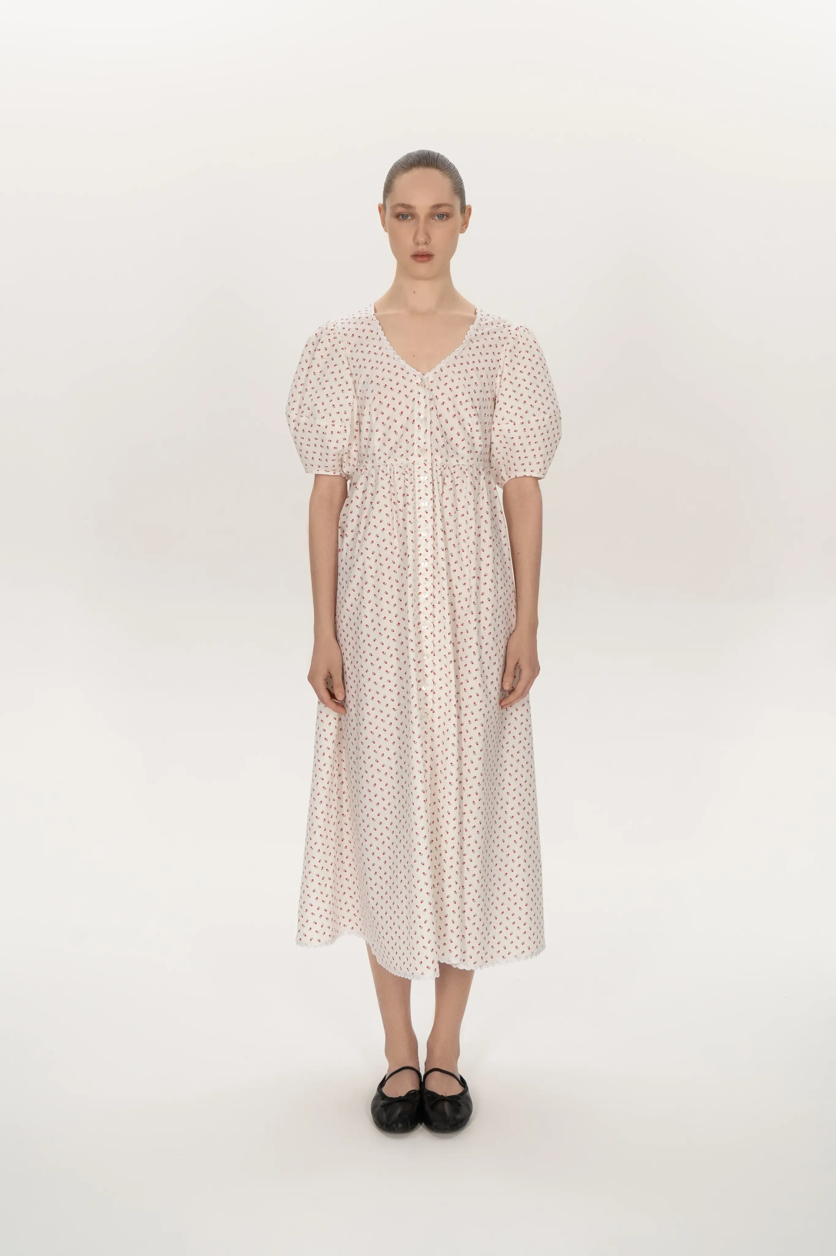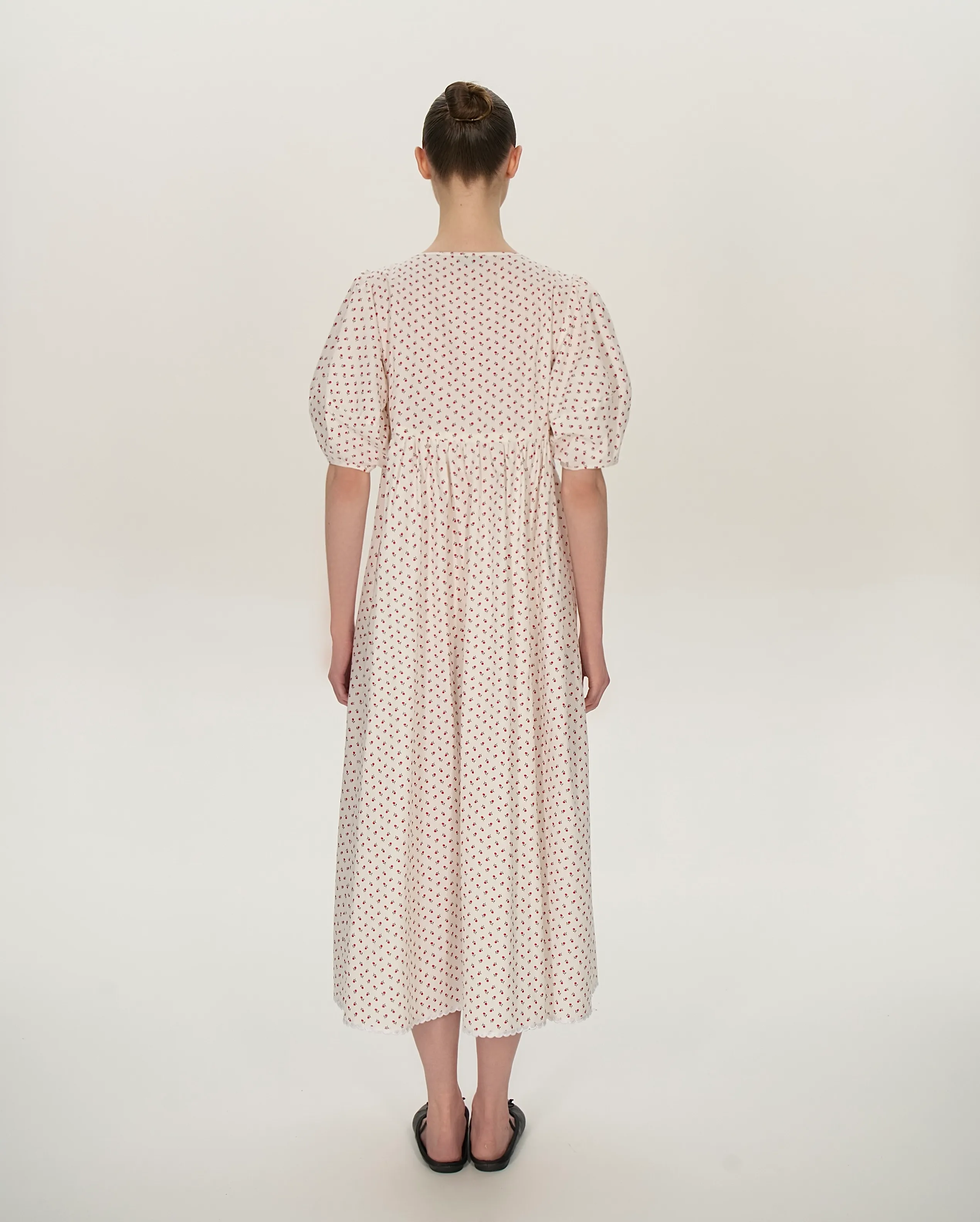 Платье миди обьемного силуэта с отрезной юбкой по чуть завышенной линии талии Рукава "фонарик", втачные обьемные на манжете с пуговицей. Платье декорировано по горловине, полочке французским кружевом