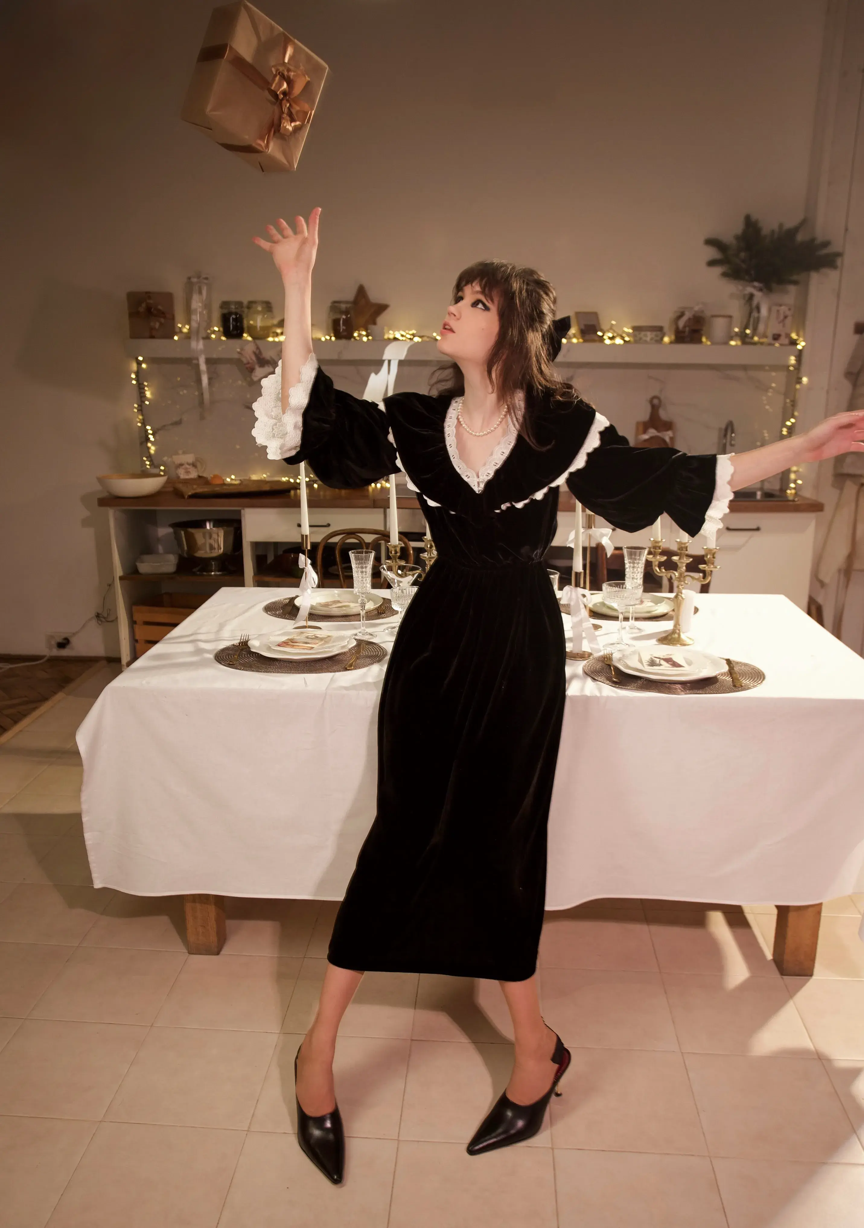 Роскошное вечернее платье "Маркиза", с пышными рукавами и рюшей по горловине изделия. Платье декорировано батистовым кружевом. Состав-бархат 100% шелк. Кружево 100% хлопок
