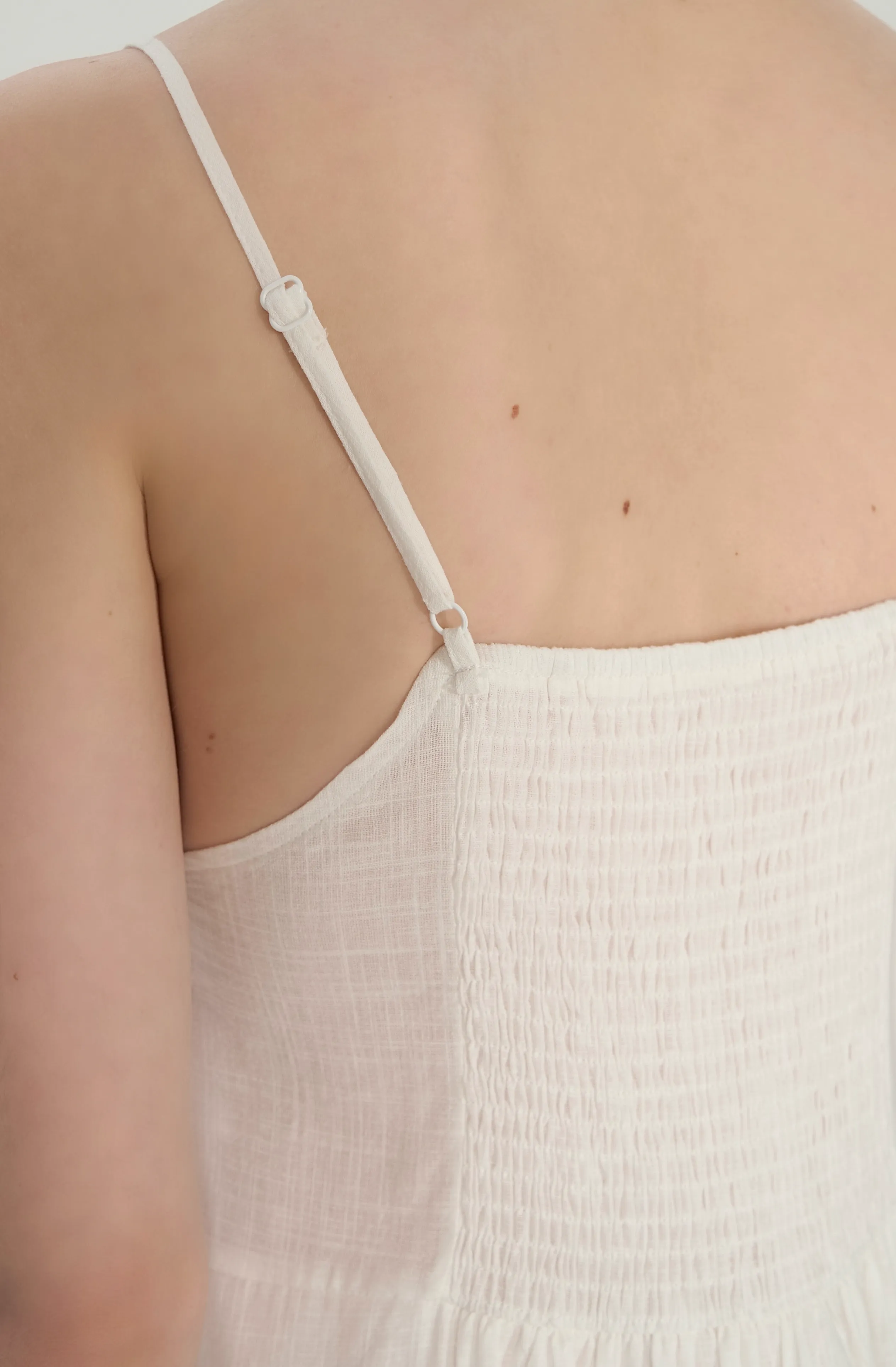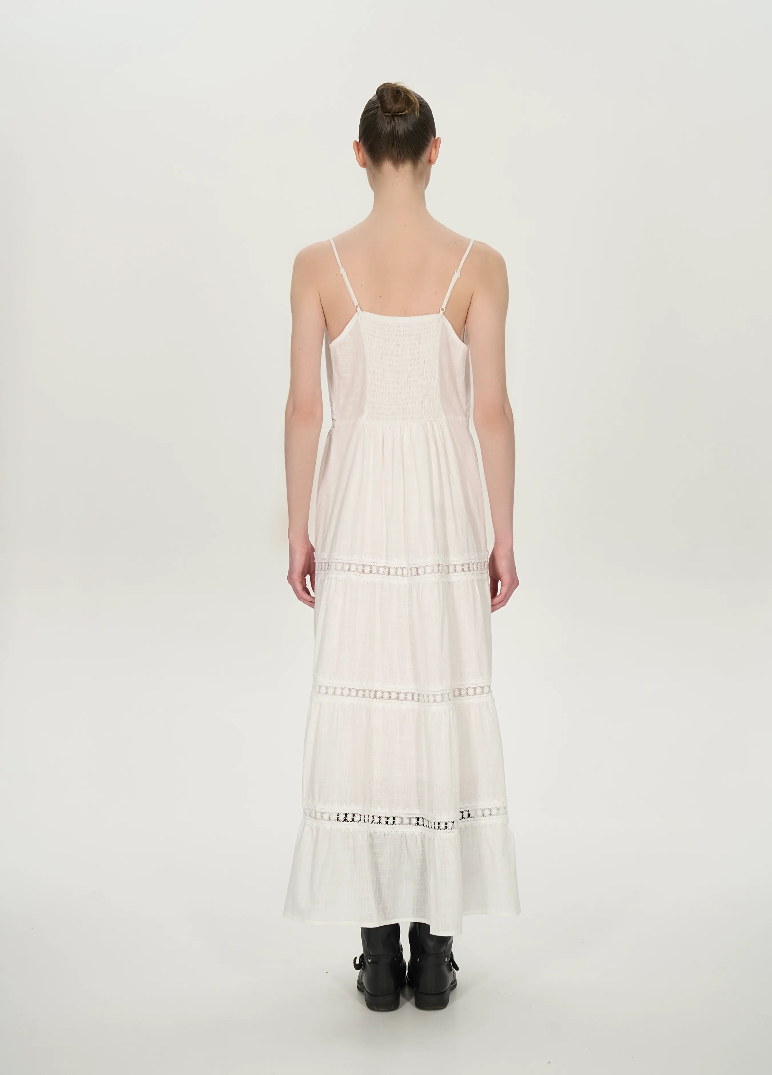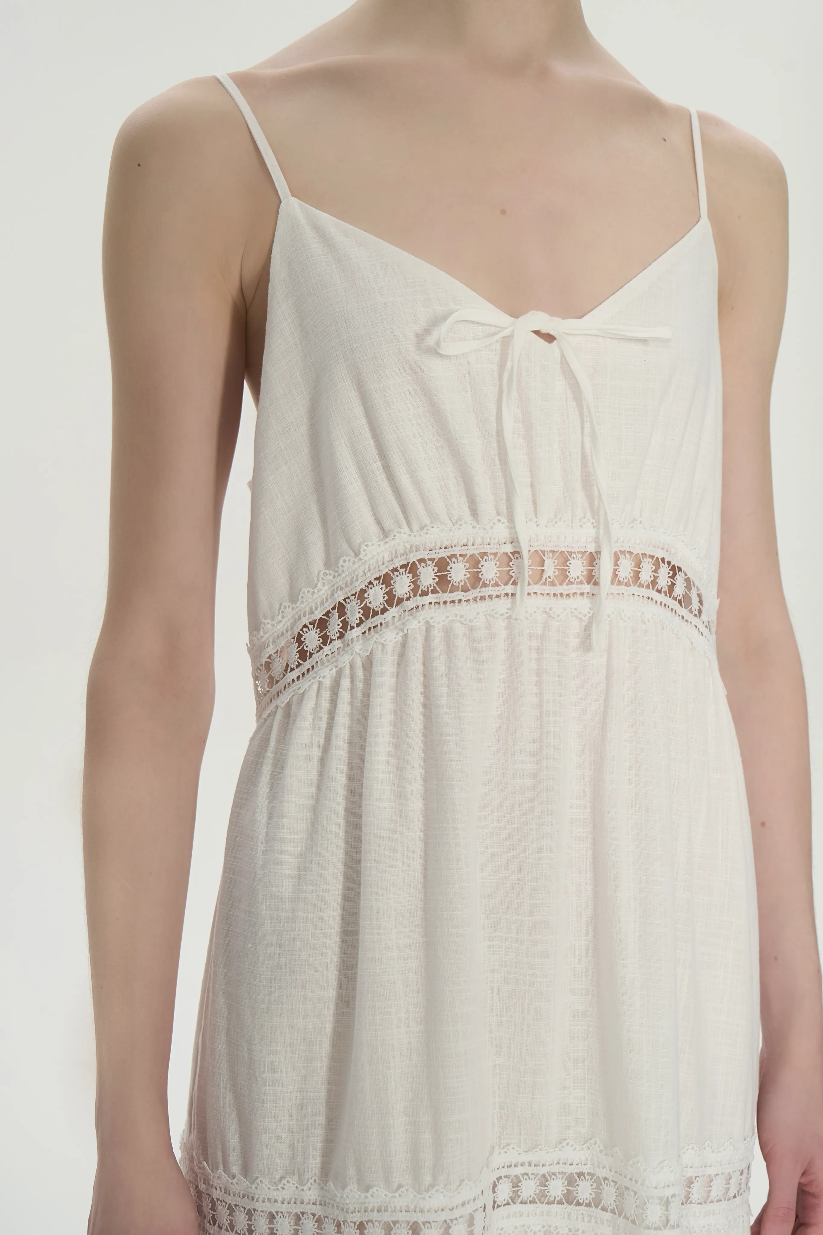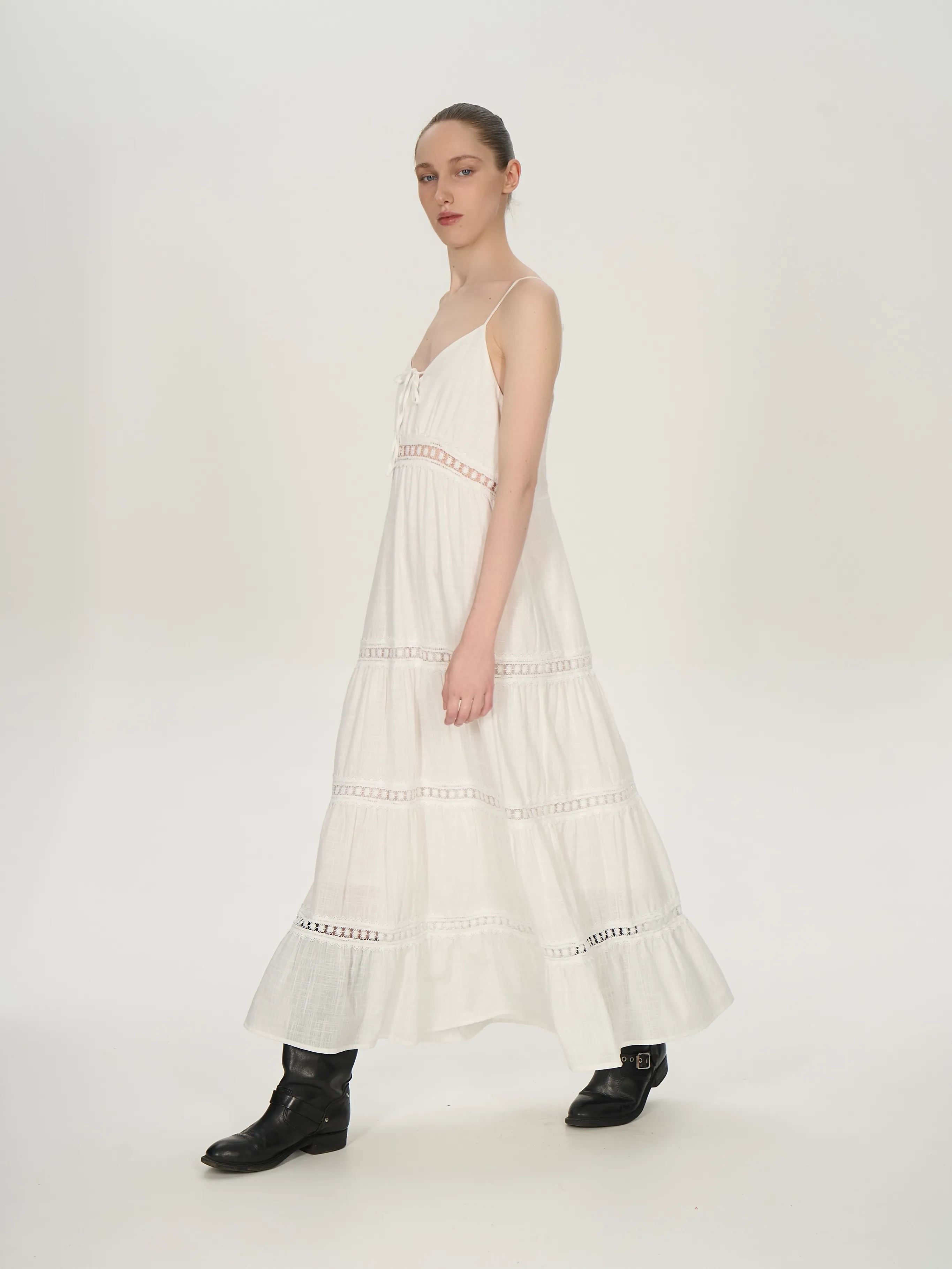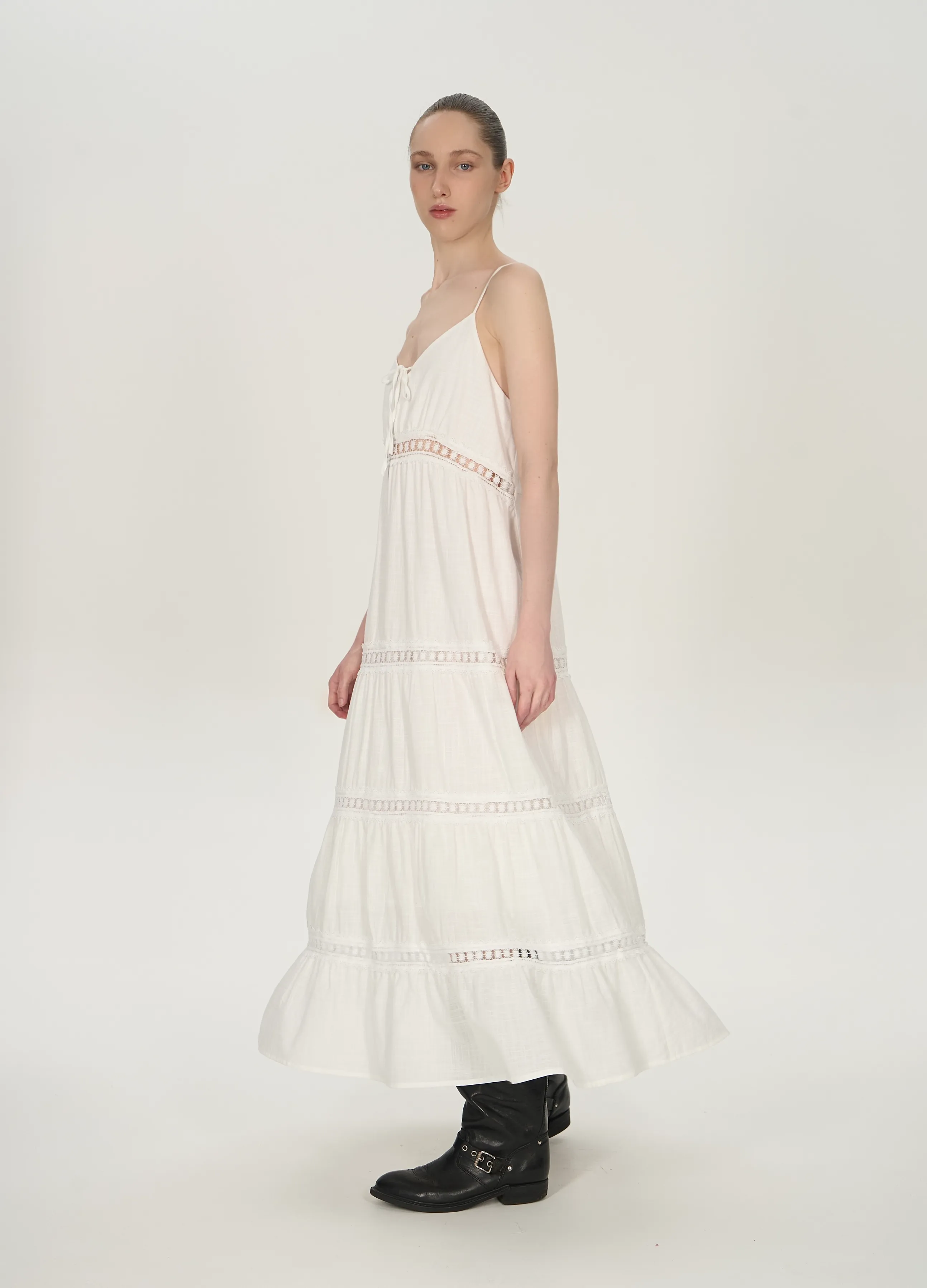 Сарафан-макси, приталенного силуэта с пышной юбкой. Платье декорировано по лифу завязочкой и кружевной тесьмой. Платье на тонкой батистовой подкладке. Ткань: 100% хлопок.