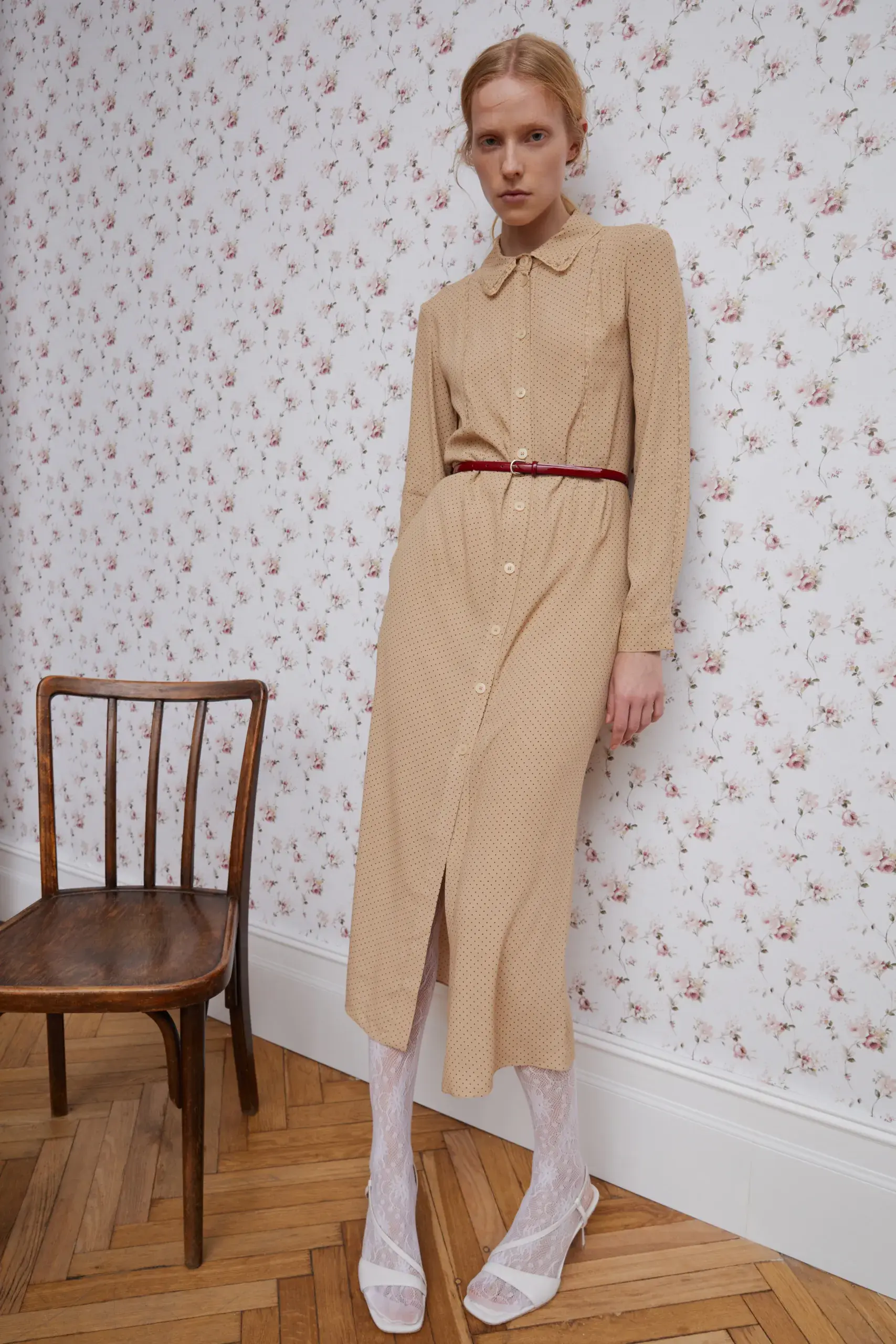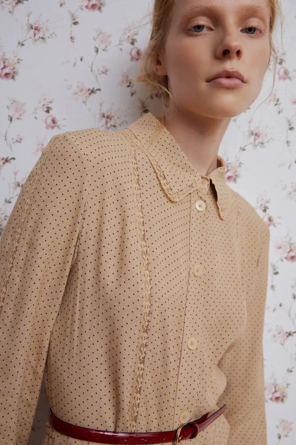 Платье с прямого силуэта, с кружевом по передней полочке, манжетам и воротнику. Принт мелкий горошек