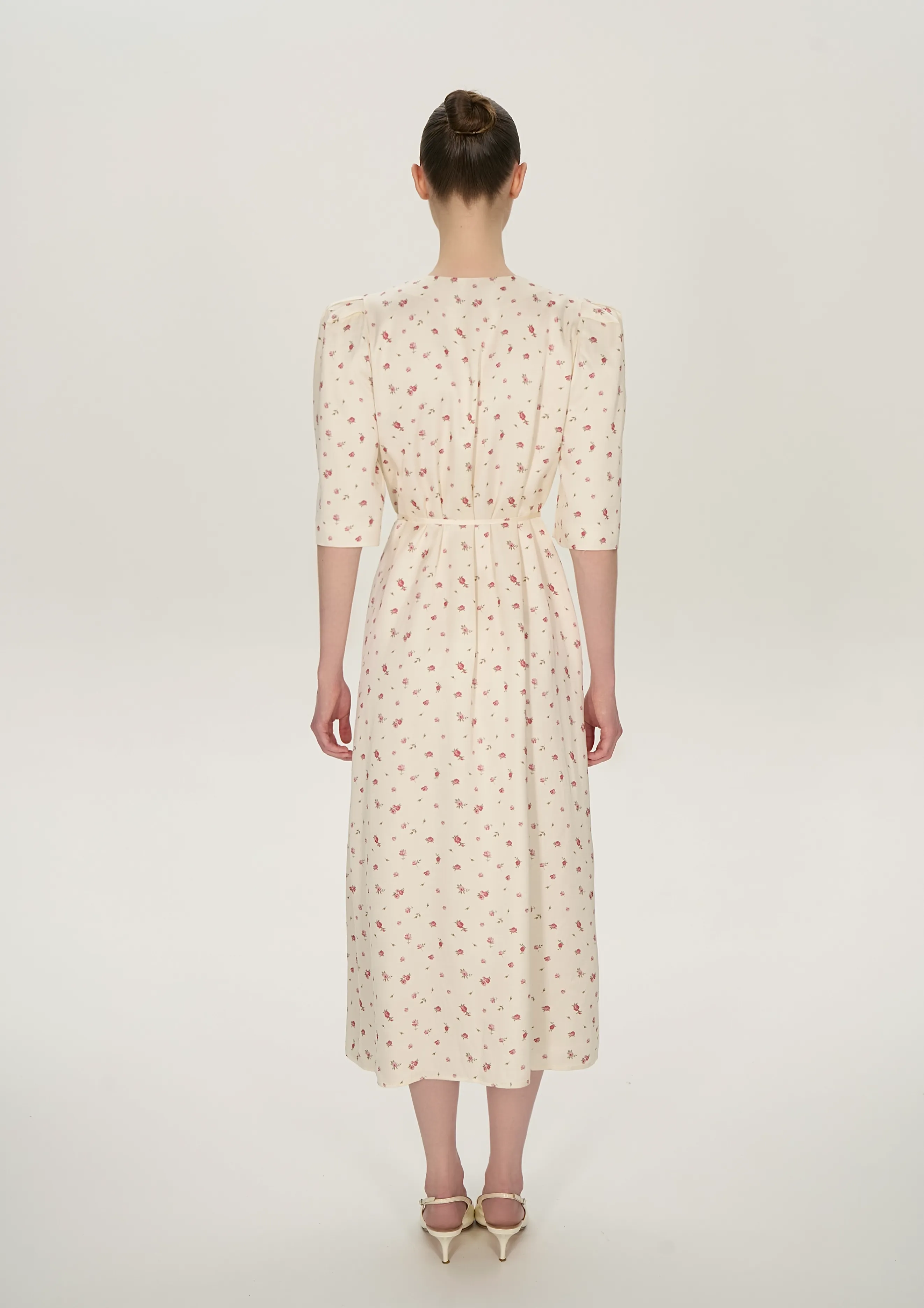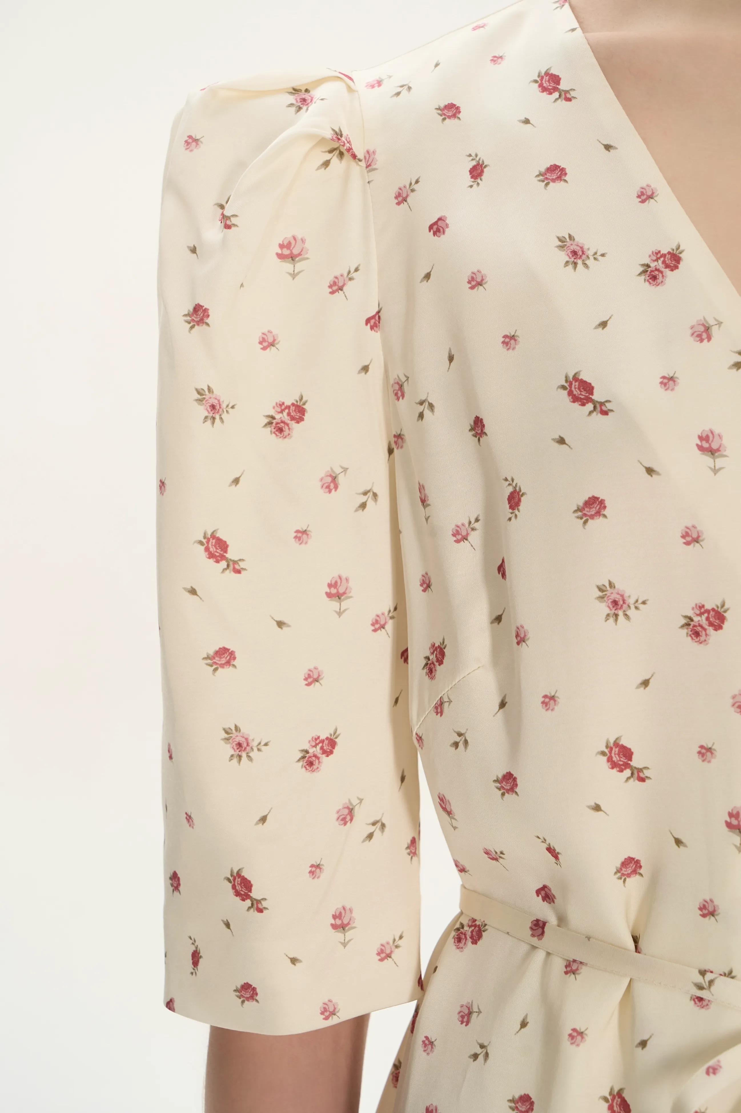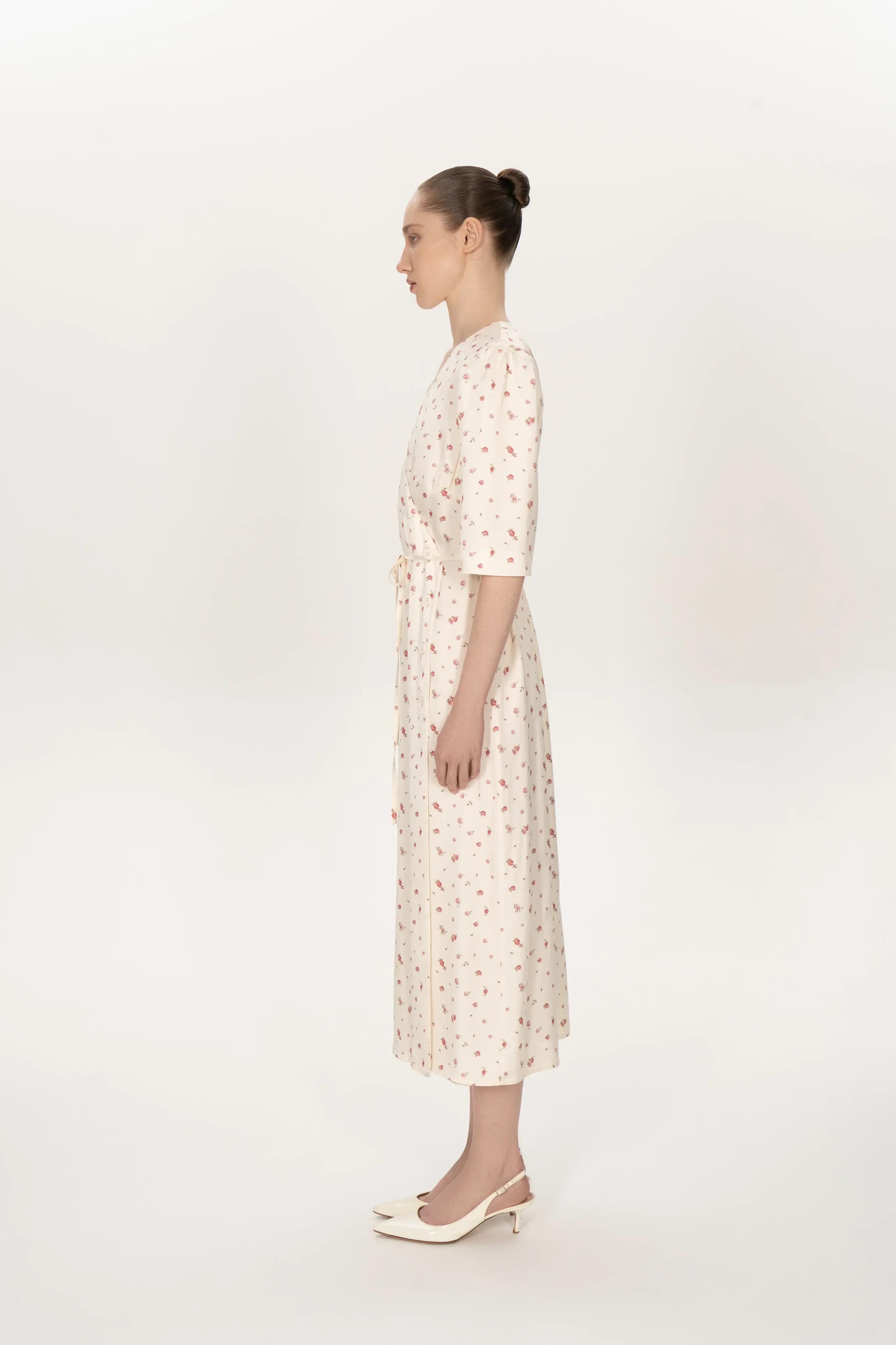 Платье миди прямого силуэта, на тонкой подкладке, с запахом, с коротким рукавом. По головке рукава рукав усилен фатином. Застежка по переду на пуговицах. Платье с поясом из основной ткани.