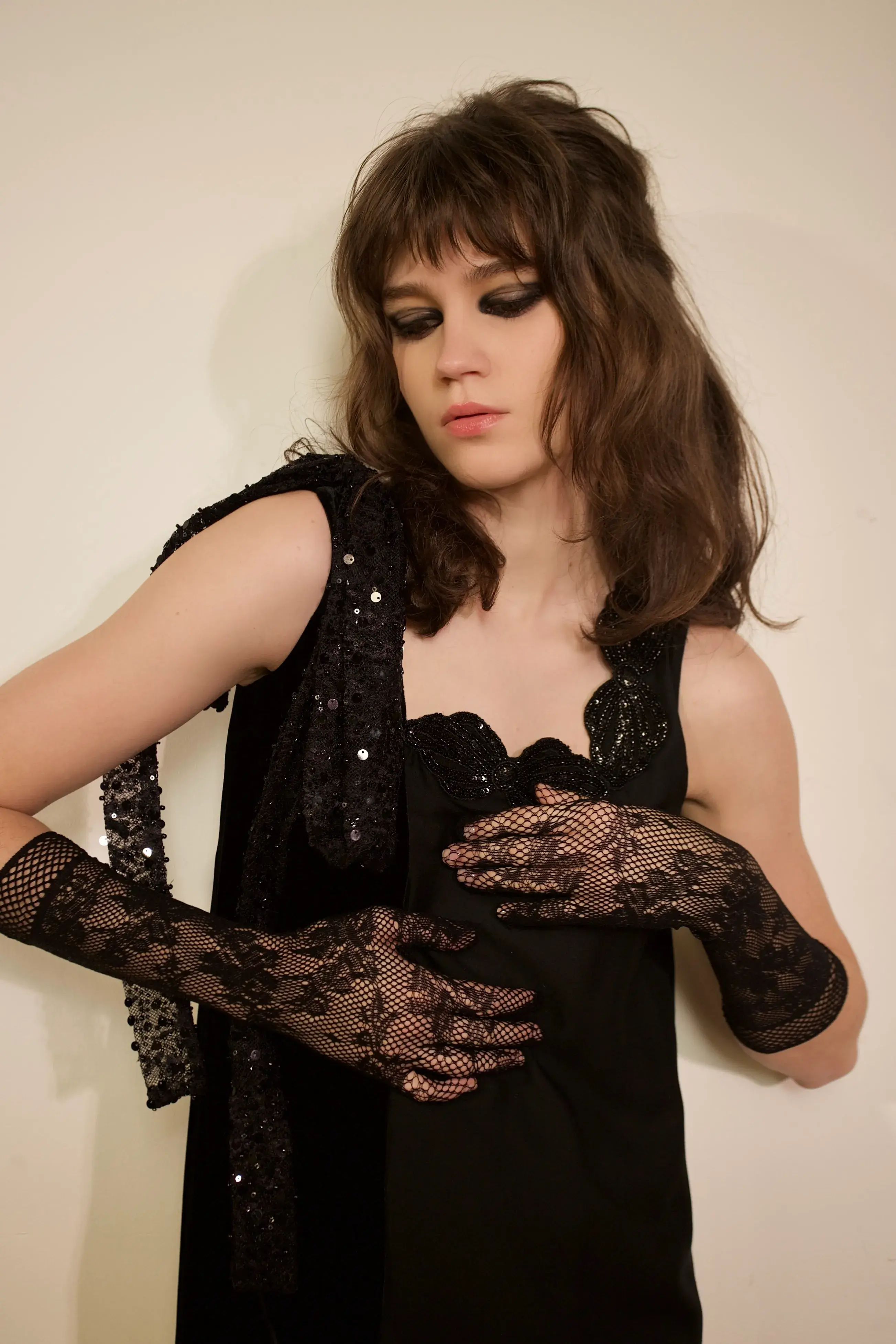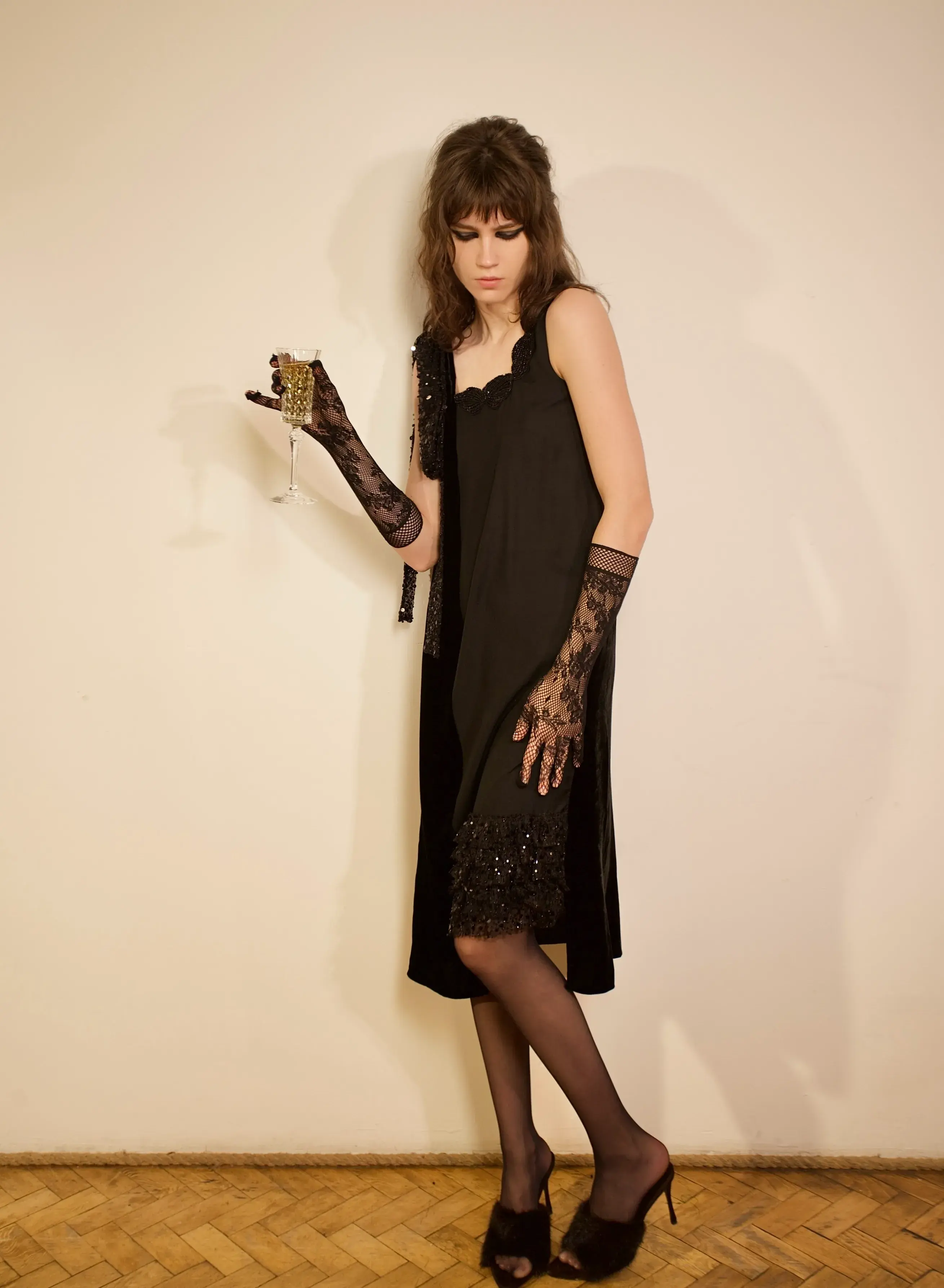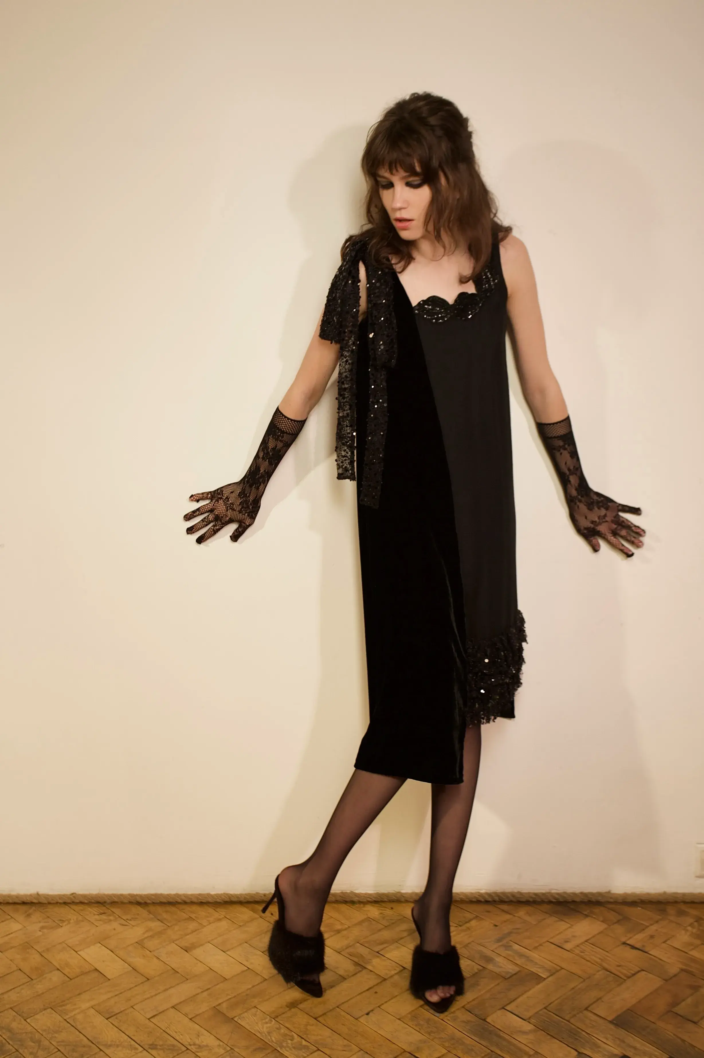 Платье "Жемчужина" прямого силуэта, без рукавов, в стите Арт-Деко. Платье декорированно вышивкой из бисера и стекляруса, а так же кружевом с пайетками. Платье состоит из двух тканей-100% шелковый бархат и 100% вискоза.